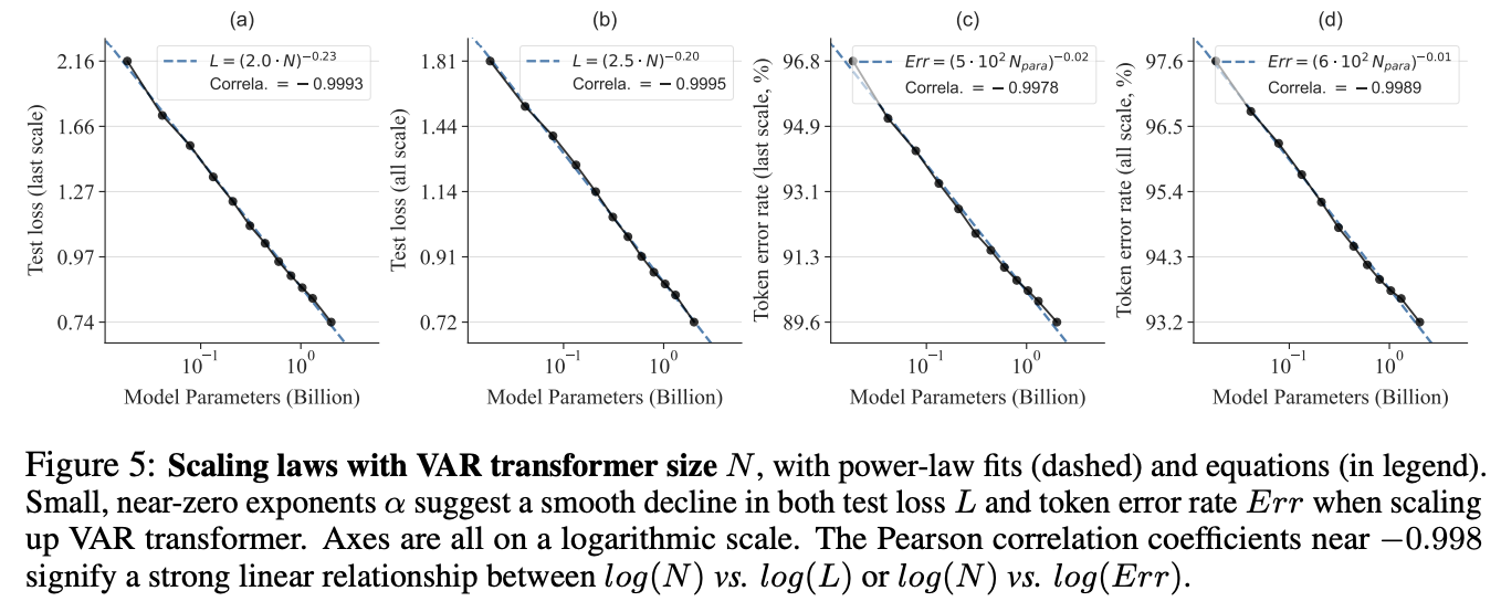 위 결과를 통해 VAR transformer를 키울수록 계속 모델의 test performance를 향상시킬 수 있다.