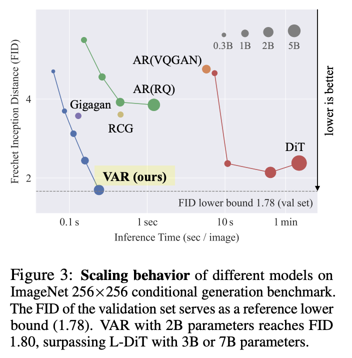본 논문은 VAR이라는 모델을 도입했는데, 이는 image autoregressive model들에 내재된 몇 문제를 이론적으로 해결했고, language-model-based AR model이 처음으로 이미지 퀄리티, 다양성, 데이터 효율성, 추론 속도에서 diffusion model을 이긴 첫 모델이다.