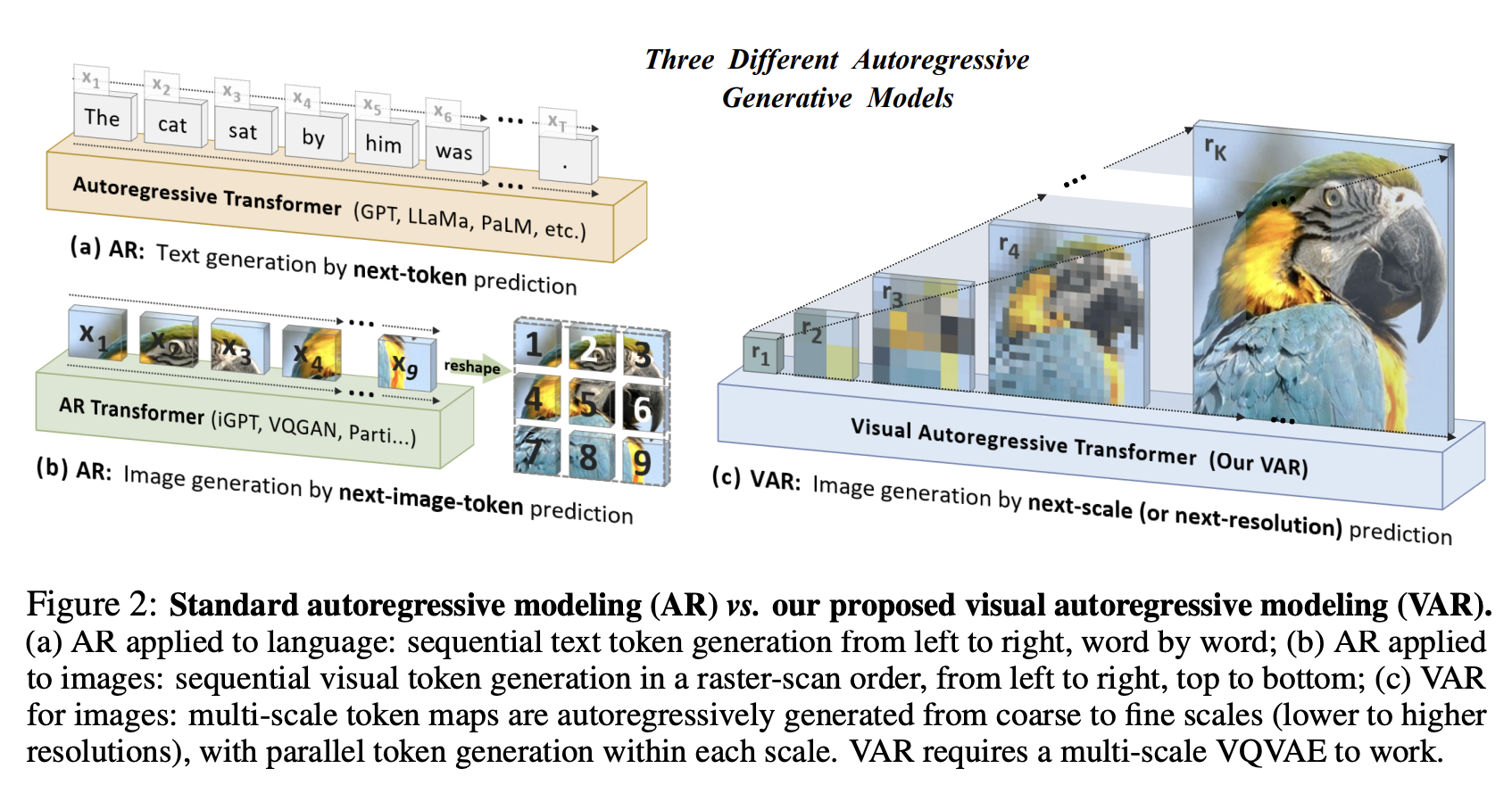Autoregressive modeling은 데이터의 order를 정의할 필요가 있다. 본 논문에서는 이미지를 어떻게 'order'할 건지를 다시 고려한다. 사람은 이미지의 global한 구조를 먼저 인지하고 그 다음 local한 디테일을 본다. 이러한 multi-scale, coarse-to-fine 방식이 이미지의 "order"를 제안한다. 본 논문에서는 아래 이미지의 (c)에서 "next-scale prediction"으로 이미지를 학습시키는 autoregressive model을 정의한다.