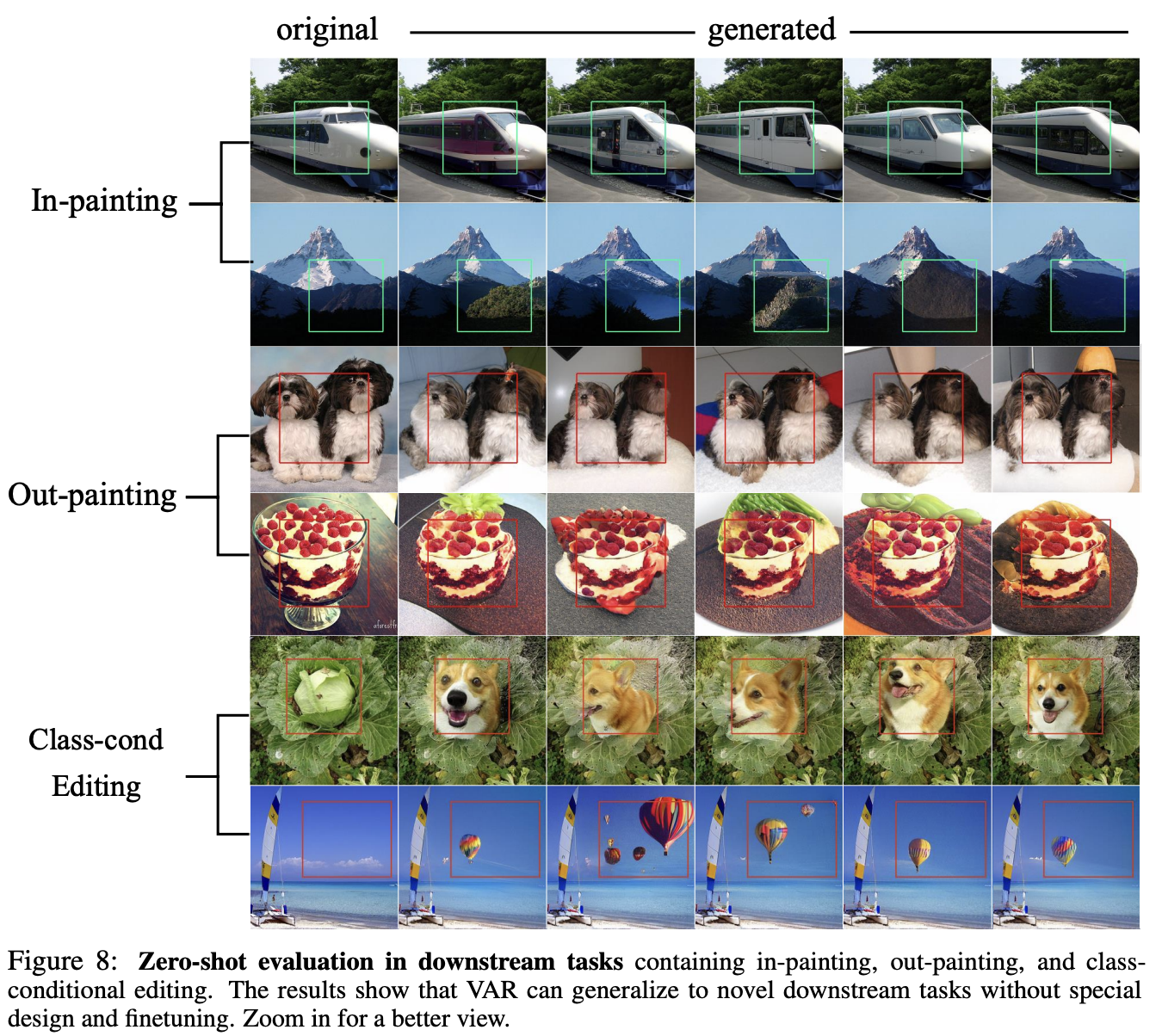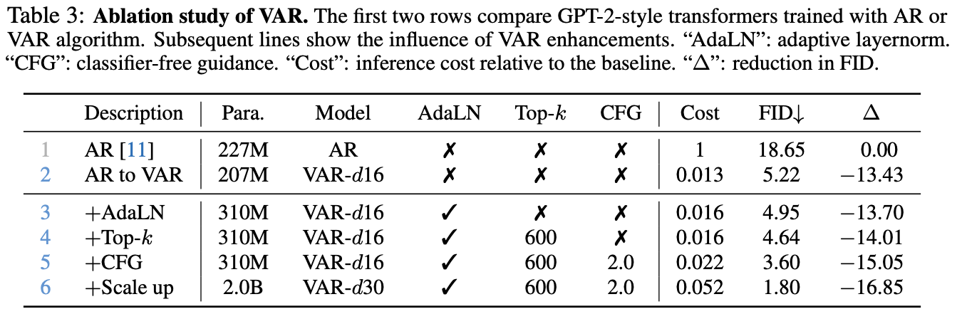 VAR이 처음으로 diffusion model을 이긴 autoregressive model이라고 한다. 위 결과들을 보면 VAR은 DiT와 같은 모델들보다 image generation에서 더 효율적이고 scalable한 모델이라고 할 수 있다.