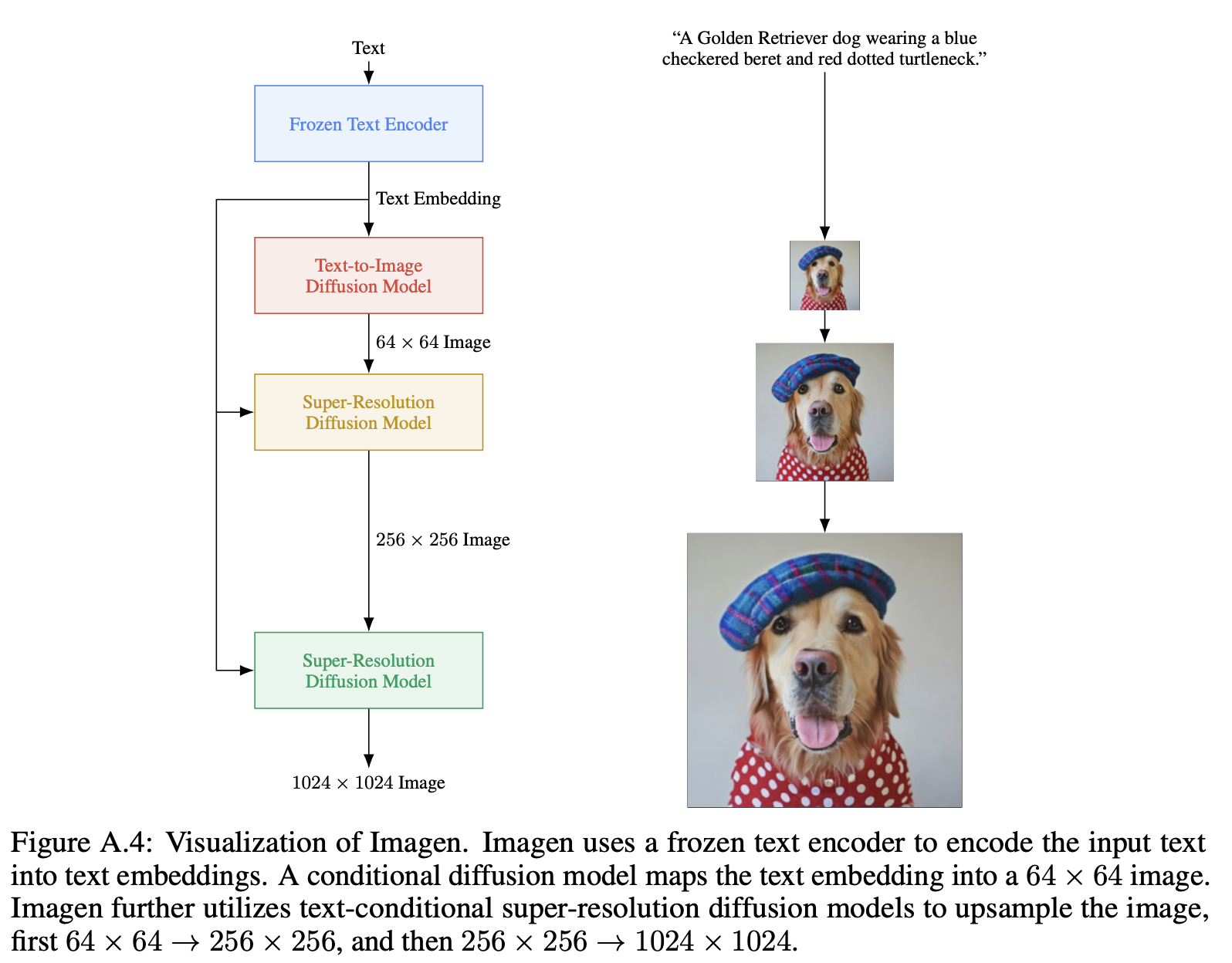 Imagen은 base $64 \times 64$ 모델의 pipeline과 $64 \times 64$의 생성된 이미지를 $256 \times 256$과 그 후 $1024 \times 1024$로 upsample하기 위해 두 개의 text-conditional super-resolution diffusion models를 이용한다. 점진적으로 high-fidelity 이미지들을 생성하는데 noise conditioning augmentation을 가진 cascaded diffusion models는 매우 효과적이어왔다. 게다가 noise level conditioning을 통해 super-resolution 모델을 추가된 noise의 양을 알도록 만드는 것은 샘플 퀄리티를 향상시키고 저해상도 모델에 의해 생성된 artifacts를 다루기 위해 super-resolution 모델들의 robustness를 향상시키는 것을 돕는다. Imagen은 두 super-resolution 모델들에 대해 noise conditioning augmentation을 사용한다. 이는 높은 fidelity 이미지 생성에 중요하다.