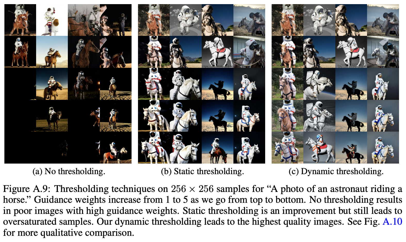 Dynamic thresholding은 각 샘플링 단계에서 $s$를 $\hat{x}^ t_0$의 특정 백분위수 절대 픽셀 값으로 설정하고, $s$가 1보다 크면 $\hat{x} ^t_ 0$을 $[-s, s]$ 범위로 임계값을 설정한 다음 $s$로 나누는 방식이다. Dynamic thresholding은 포화 픽셀(-1과 1에 가까운 픽셀)을 안쪽으로 밀어내어 각 단계에서 픽셀이 포화되는 것을 적극적으로 방지한다. 본 논문에서는 dynamic thresholding이 특히 매우 큰 guidance weights를 사용할 때, 더 좋은 image-text alignment 뿐만 아니라 더 좋은 photorealism을 야기한다는 것을 발견했다.