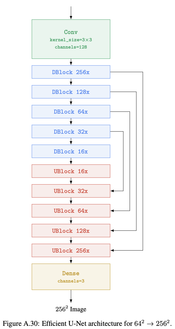 $64 \times 64 \rightarrow 256 \times 256$ super-resolution에 대해 본 논문은 메모리 효율, 추론 속도, 수렴 속도를 향상시킨 Efficient U-Net을 사용한다.