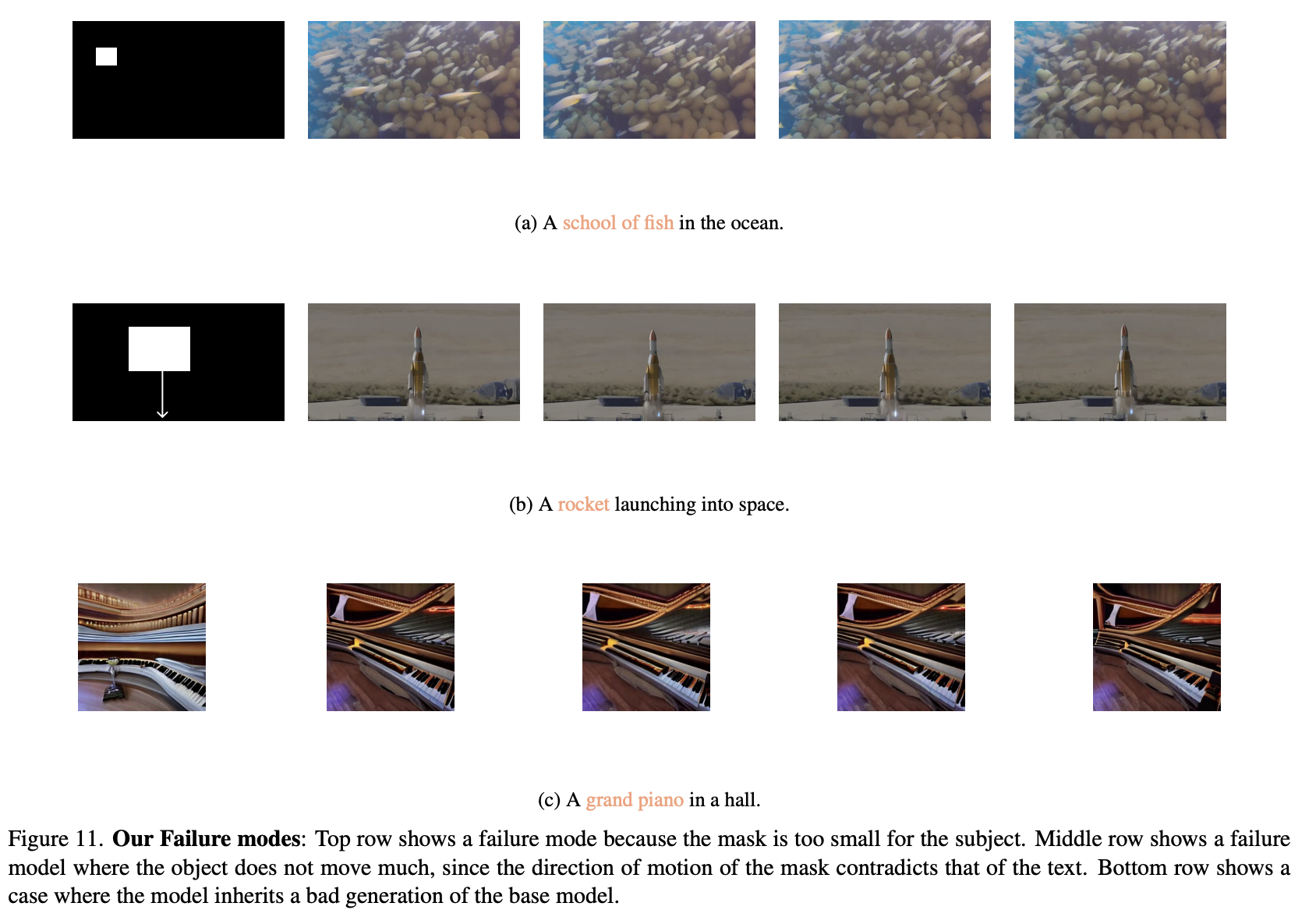 위 이미지에서 main subject가 원하는 경로로 움직이는 것을 보여준다. 본 논문의 method는 다양한 모션 궤적에 대한 현실적인 움직임을 생성한다. 본 논문의 temporal masking은 이미지 1에서 첫 번째 행에서와 같이 중간에 mask가 사라지는 경우도 다룰 수 있으며 spatial과 cross attention masking은 input bounding box와 생성된 프레임의 공간적인 일관성을 보장한다.