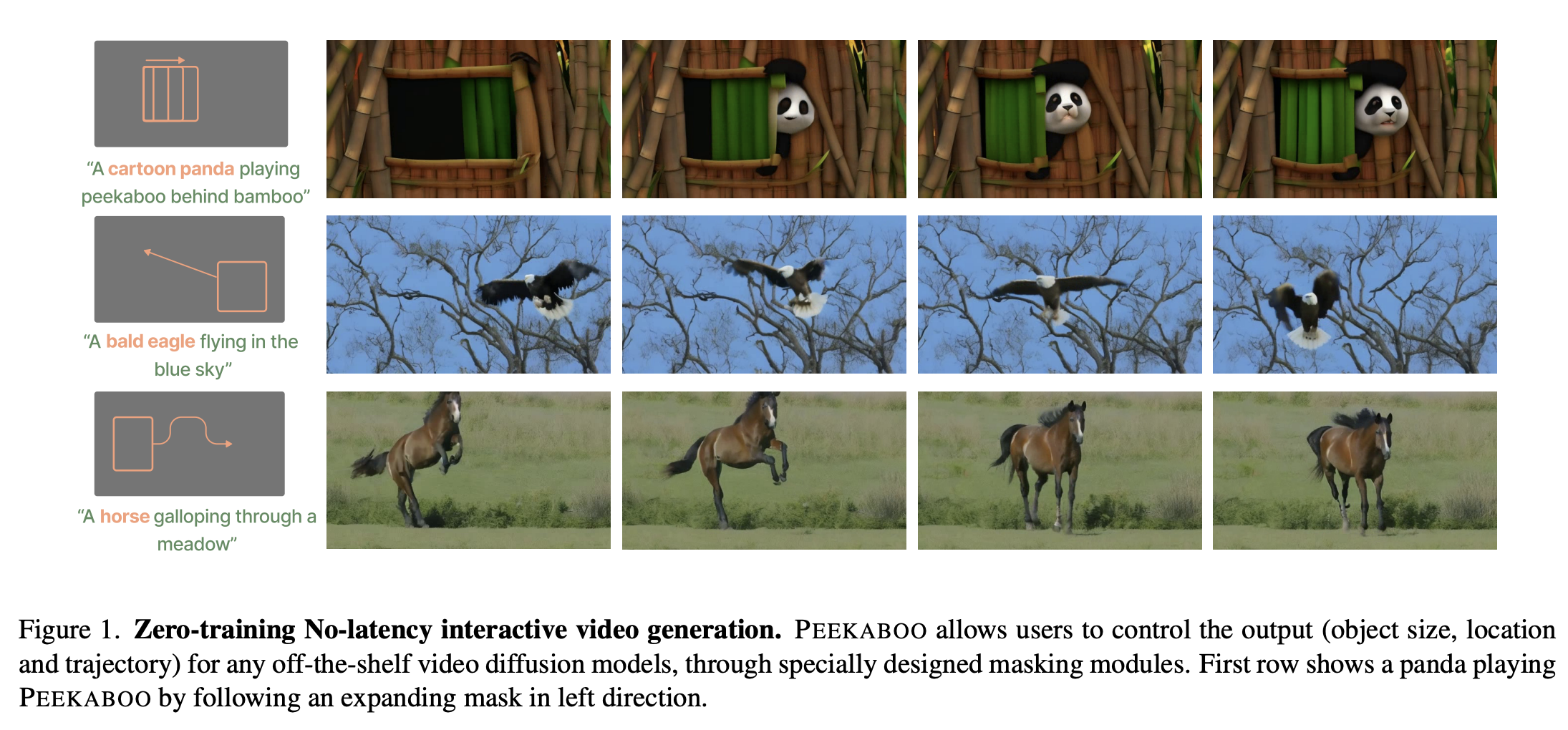 - 본 논문에서는 PEEKABOO를 도입한다. 이는 i)U-Net 기반의 video generation의 output에 대해 spatio-temporal과 motion control을 야기함으로써 interactive video generation을 가능하게 하고 ii) training-free이고, iii) 추론 시간에 추가적인 지연을 더하지 않는다.