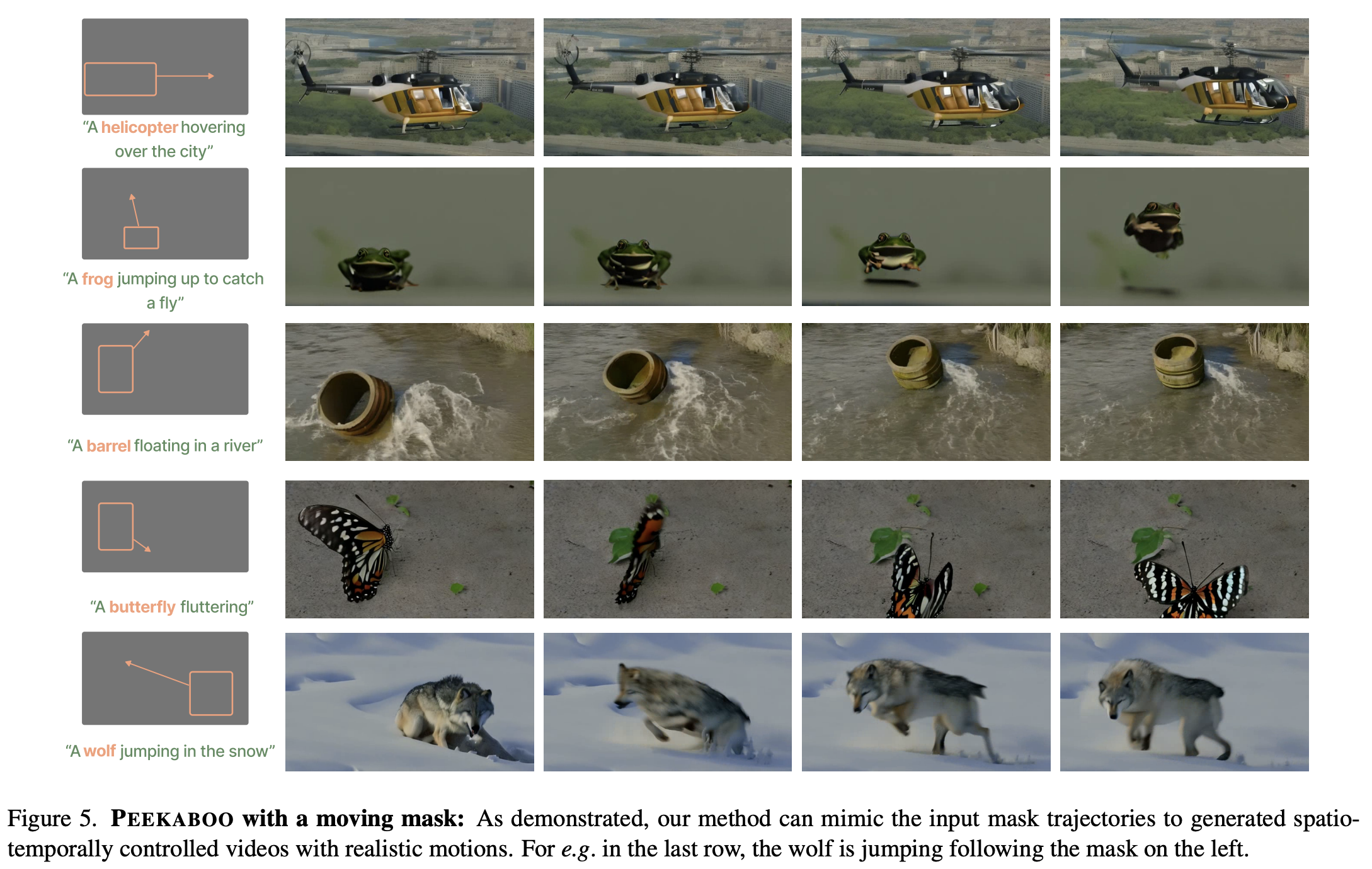 위 이미지는 ZeroScope에 PEEKABOO를 적용해 video를 생성해낸 결과이다. Video는 bbox input을 따른다. 본 논문은 모양, 크기, 위치, 행동을 캡쳐하는 bbox input의 다재다능함을 강조하고, 이 정보를 PEEKABOO가 어떻게 interactively하게 활용하는 지 보여준다.