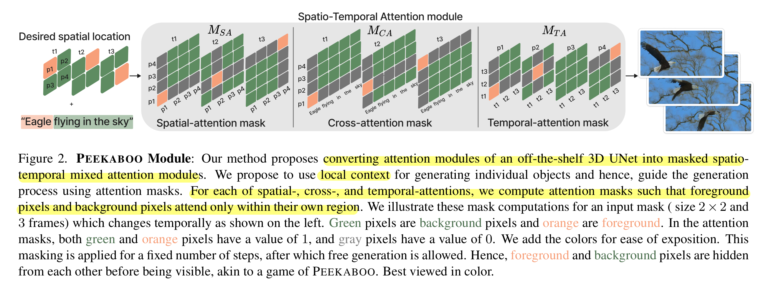 Diffusion Pipeline에 이 선택적인 mask들을 넣는 것은 본 논문이 PEEKABOO라고 부르는 zero-training 방식이다. PEEKABOO는 text-to-video 모델들의 3D-UNet 아키텍쳐의 attention layer들에 통합된다. 본 논문의 method에서 고정된 수의 스텝 $t$에 대해 foreground와 background object의 선택적인 생성을 수행하고 그러고 나서 나머지 스탭에 대해 free-generation을 허용한다. 이 free-generation은 foreground와 background 픽셀 서로에게 응집력있게 통합되도록 한다. 본질적으로, 본 논문에서의 method는 볼수 있게되기 전 몇 time 스텝에서 foreground 픽셀은 backgorund 픽셀을 보지 못하고 역도 마찬가지이다.