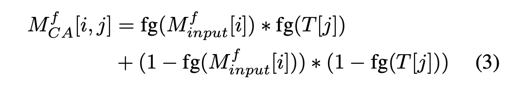 각 프레임 $f$에 대해, $l_{latents} \times l_{text}$ 크기의 2차원 행렬인 attention mask $M^f_{CA}$를 계산한다. 이 마스크는 각 픽셀-토큰 페어에 대해, 픽셀과 토큰이 모두 foreground이거나, 모두 background이면 1이다.