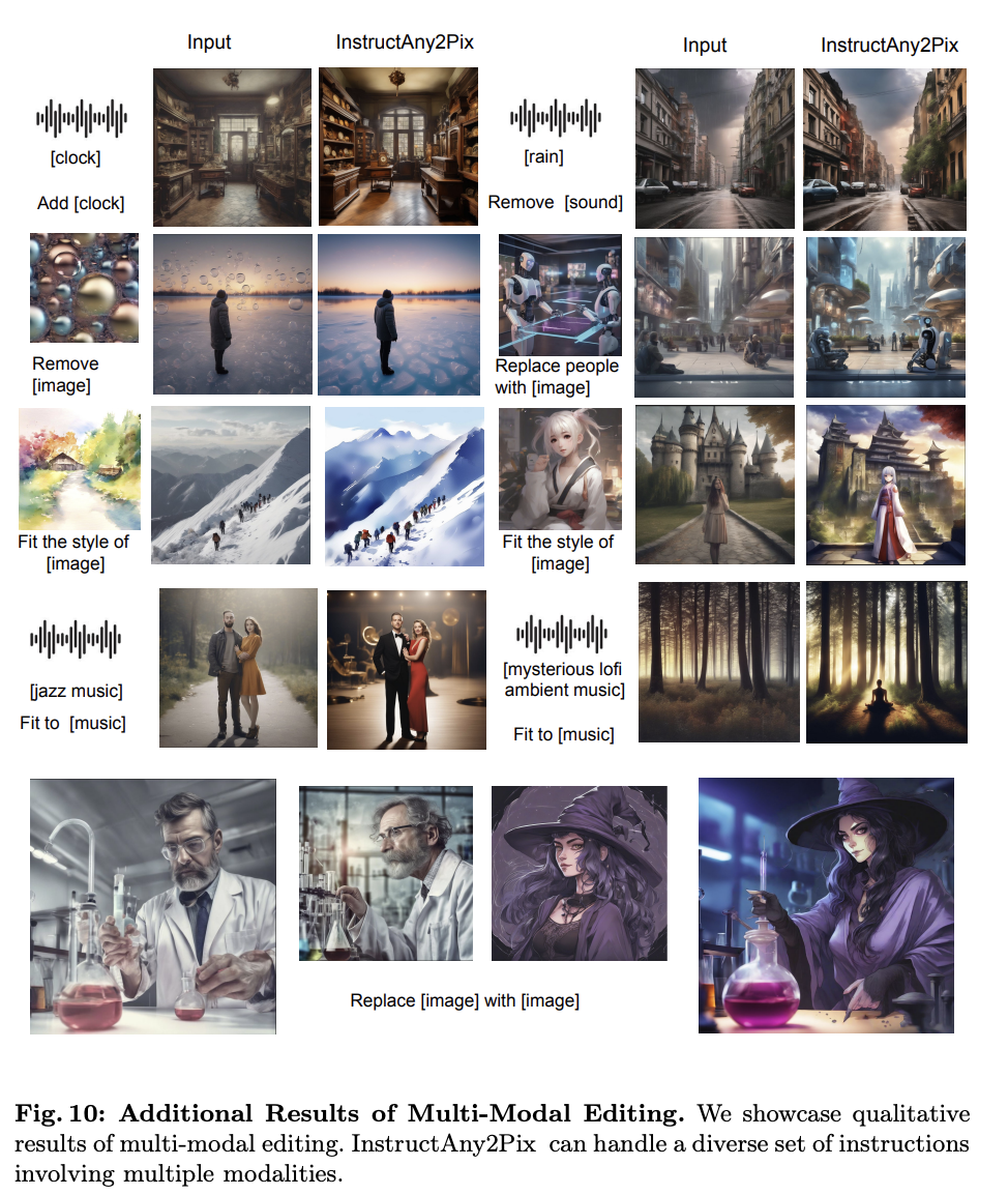 본 논문에서는 InstructAny2Pix를 제안하는데, 이는 복잡하고 multi-modal이고, multi-object 지시를 따를 수 있는 첫 instruction-following image editing 시스템이다. Instruction의 예시로는 "add the [sound] to [image]"나 "add [object A] and remove [object B] from [image]"가 있다. 여기서 object들은 이미지, 텍스트, 오디오로 표현될 수 있다. 본 논문의 시스템은 "change [image A] to the style of [image B]"나 "fit [image] to [music]"와 같이 자유 형식 instruction들도 수용한다. 이 연구는 이미지 수정 instruction들의 범위를 상당히 넓혀준다. 정성적, 정량적 평가를 통해 본 논문의 method는 다양한 editing task에서 높은 performance를 보인다.