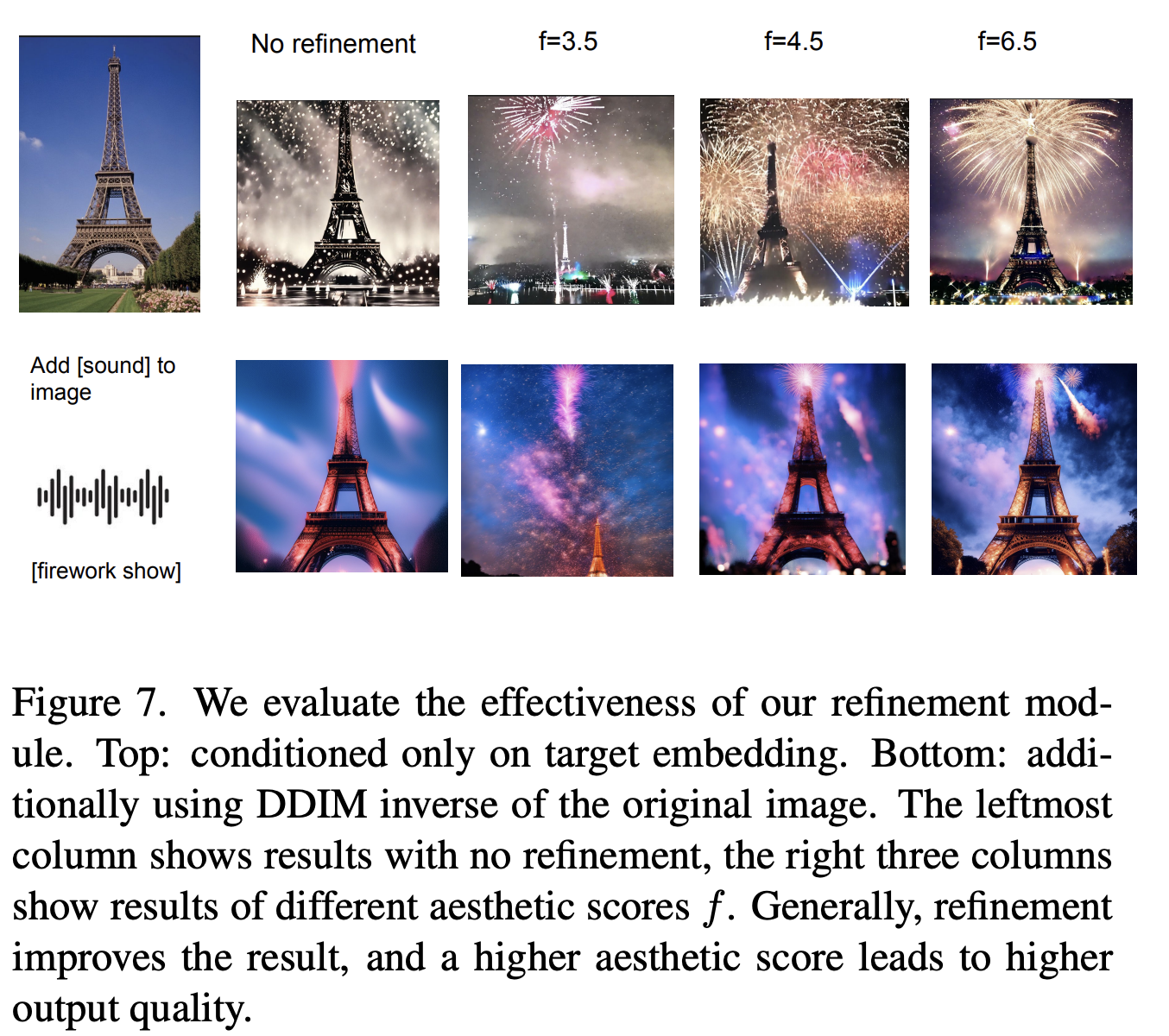 Alignment step에서 사용된 이미지들에서 low quality 이미지들이 많다는 것이 관찰됐다. 이들 중 대부분은 audio-image 페어에서 왔다. 데이터셋의 LAION aesthetic score를 평가함으로써 이를 검증했다. Low quality 데이터의 영향을 완화하기 위해, refinement module을 통합한다. 이는 embedding space에서 이미지의 quality를 향상시키도록 학습하는 transformer이다. 이미지와 그의 향상된 버전의 페어로 된 데이터셋을 얻기 힘들기 때문에, 존재하는 image-text와 image-audio pair를 이용한다. Multi-modal encoder의 embedding space가 align됐기 때문에, $Pr(x|e,s)$를 직접 모델링할 수 있다. ($x$는 이미지, $e$는 embedding, $s$는 aesthetic score) 학습동안 text와 audio embedding을 사용할 수 있고, 추론 때는 image embedding으로 이를 대체할 수 있다.