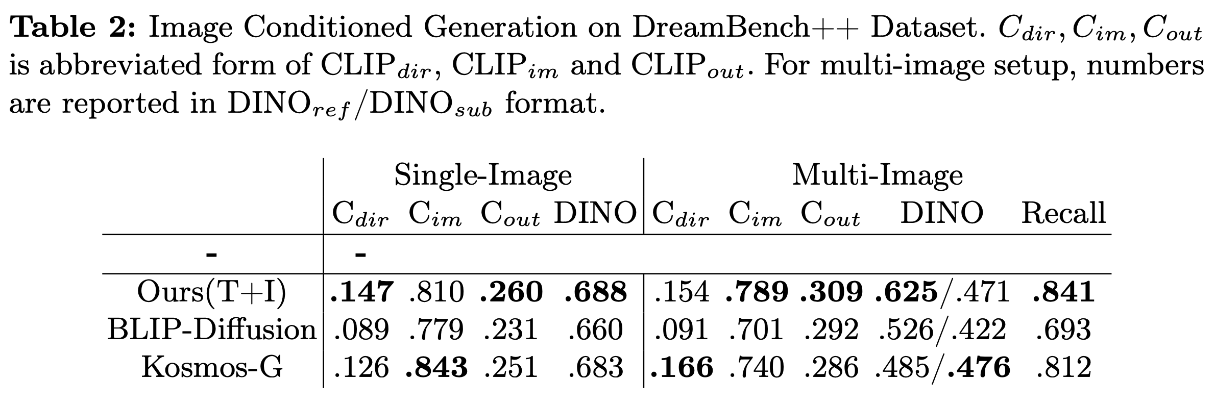 Single Image에 대해서는 DINO score로 image 유사도를 측정했고, multi image에 대해서는 잘려진 subject와 referece subject image 사이의 DINO 유사도을 측정하는 $DINO_{sub}$와 전체 결과와 background input 이미지 사이의 DINO 유사도를 측정하는 $DINO_{ref}$를 사용해서 측정했다.