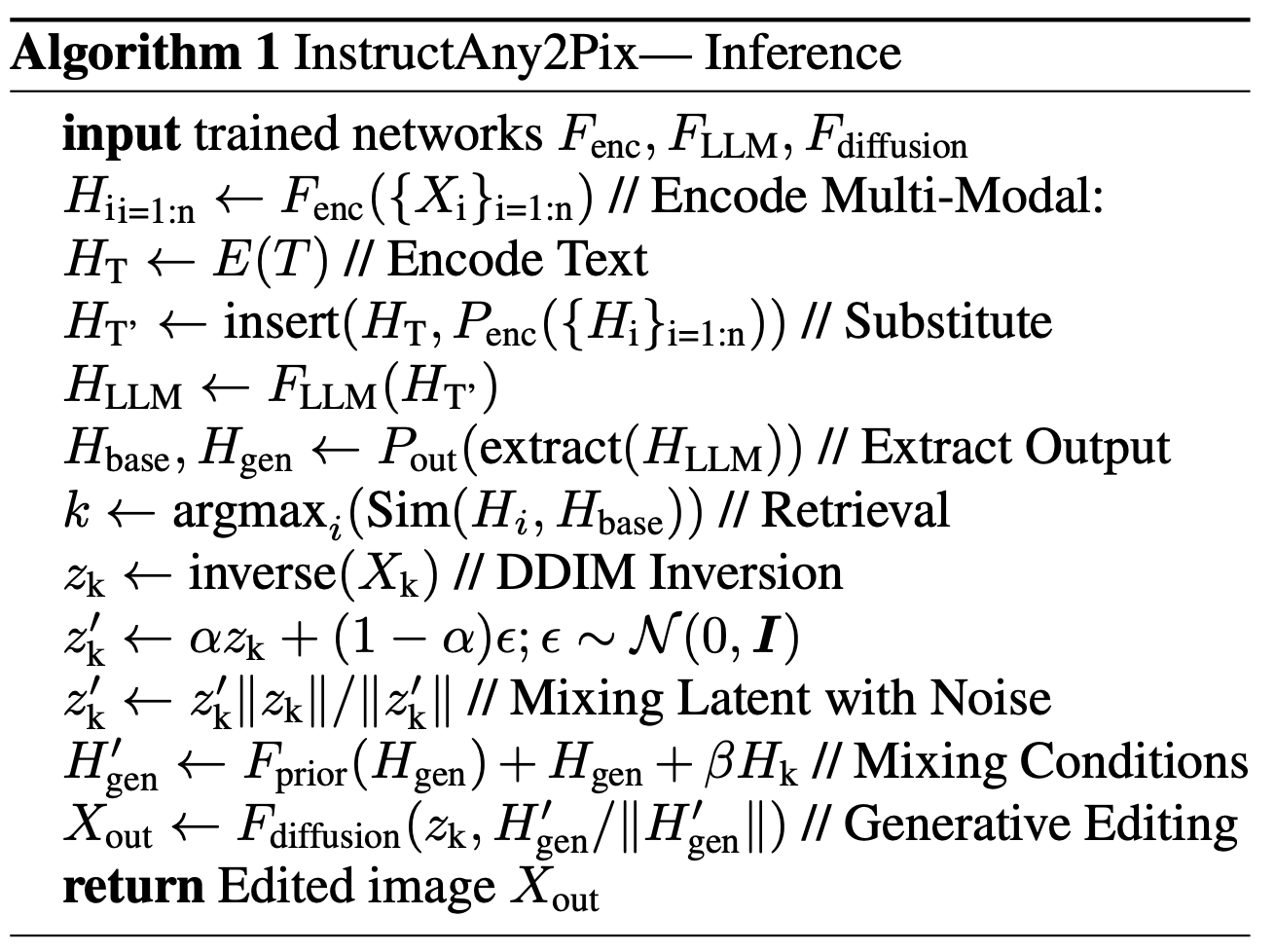 본 논문에서는 multi-modal, multi-object insturction들을 베이스로 image를 editing하는 유연한 시스템인 InstructAny2Pix를 제안한다. 본 논문은 instruction의 범위를 확장하고 반복적인 chain-of-editing에 의존하지 않고 복잡한 instruction을 수행할 수 있다. 또한 end-to-end finetuning을 제거함으로써 training 효율성을 향상시킨 새로운 training scheme을 제안한다.