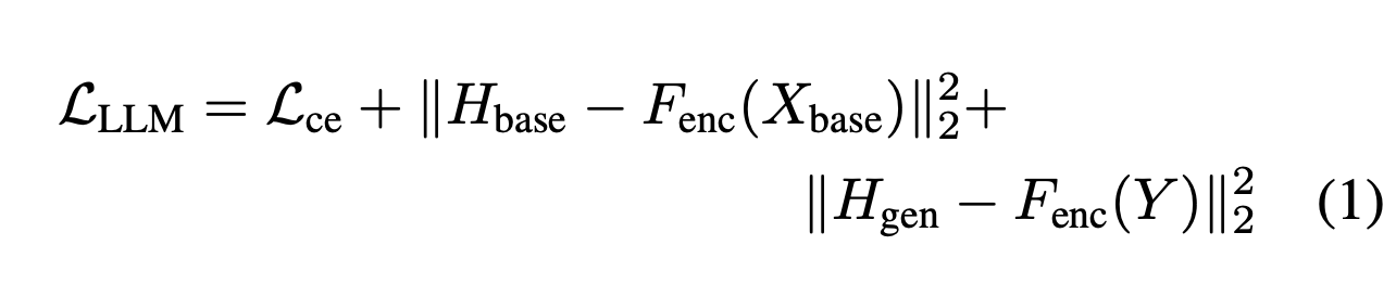 Multi-modal inputs $ \{ X_i \}_{i = 1:n}$를 참고하는 [image],[audio]와 같은 reference token들을 포함하는 text sequence $T$가 input으로 주어지면, 먼저 multi-modal encoder $F_{enc}$를 이용해 $\{H_i \}_{i=1:n} = F_{enc}(\{ X_i \}_{i=1:n})$의 embedding을 생성한다. 그런 다음 LLM의 input embedding layer $E$를 이용해 embedded representation $H_T = E(T)$를 얻는다. 다음 단계는 $H_T$의 대응되는 위치에 $\{H_i \}_{i=1:n}$를 넣는다. LLM의 embedding space로 $\{H_i \}_{i=1:n}$를 project시키기 위해 projection layer $P_{enc}$를 사용한다. 이를 통해 새로운 embedding sequence $H_{T}^{\prime}$를 얻는다. 이를 LLM에 넣음으로써 $H_{LLM} = F_{LLM}(H_{T}^{\prime})$를 추출하고 그런 다음 두 개의 특수 토큰 [base]와 [gen]에 해당하는 위치를 찾는다. 이렇게 하면 두 개의 임베딩 $H_{base}, H_{gen}$이 생성된다. 임베딩을 인코더의 임베딩 공간에 다시 매핑하기 위해 추가 projector $P_{out}$을 사용한다.
