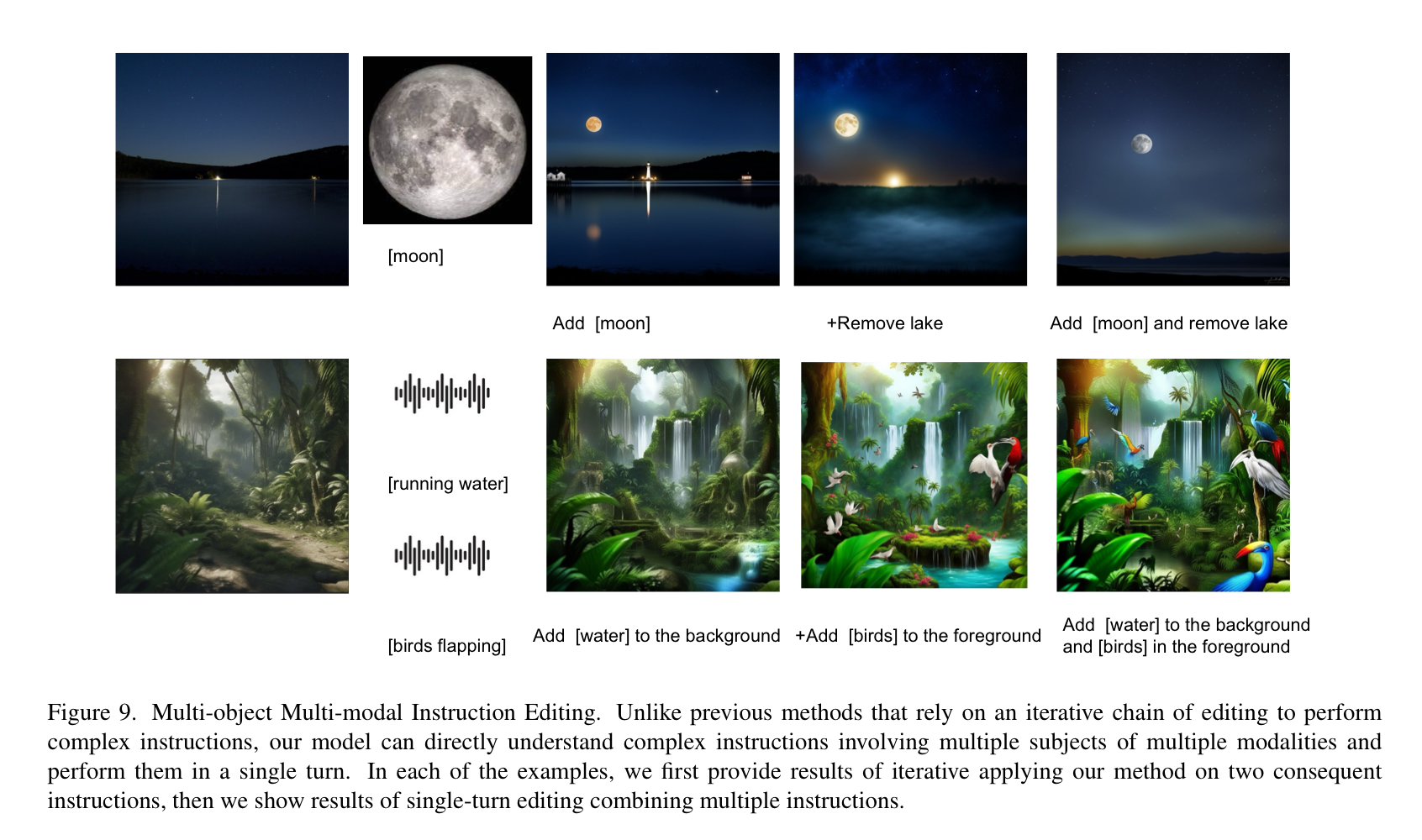 첫째, 본 논문의 모델은 많은 양의 multi-modal edit instruction들로 학습된다. 학습 데이터셋은 incorporating audio into image, adding image to image, adding multiple objects, replacing object with another object (이때 object는 image, text, audio로 표현됨)를 포함한다. 이 데이터셋은 각 instruction의 카테고리에서 인간이 만든 예시들로 SOTA LLM을 prompting함으로써 생성한다. 이 다양한 데이터셋은 image-editing 시스템의 instruction-following 능력들을 확장하는데 중요하다.