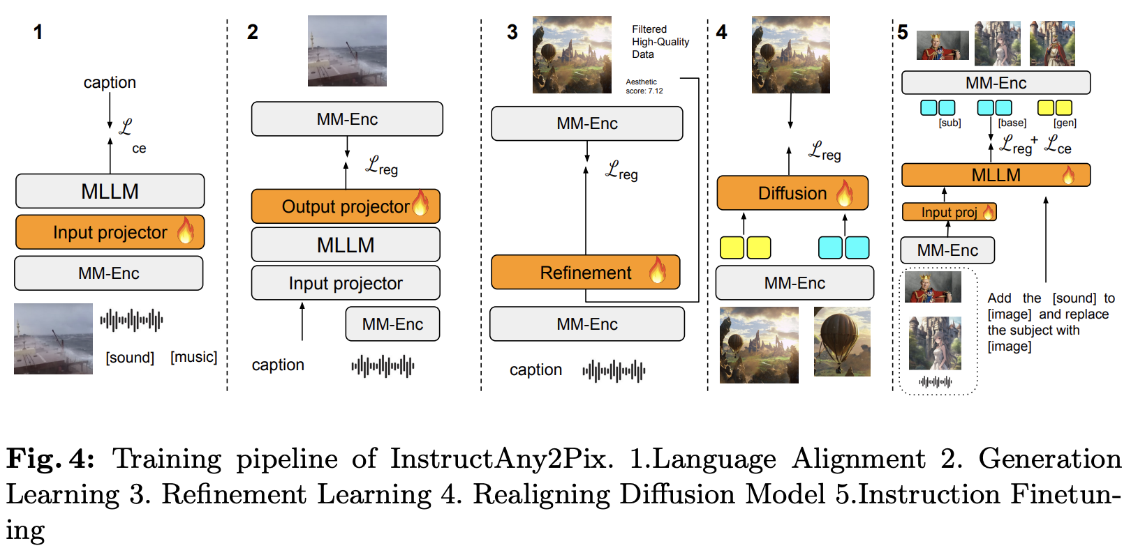 InstructAny2Pix의 training pipeline은 다음 이미지와 같이 5단계로 구성된다.