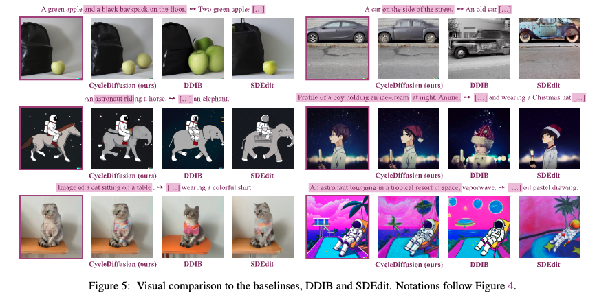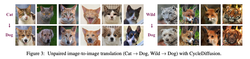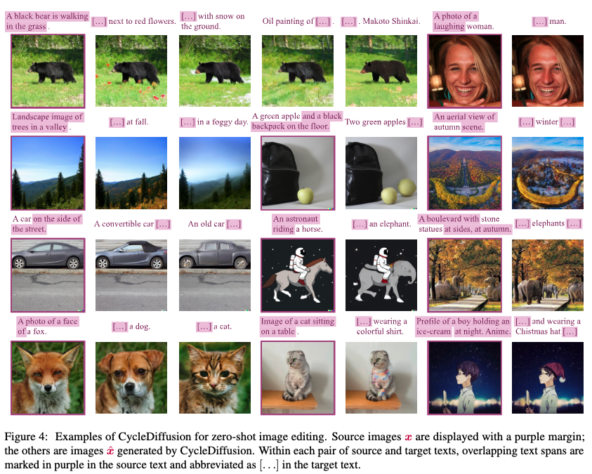 또한 두 개의 text로 condition된 image 분포 $\mathcal{D}_1, \mathcal{D}_2$를 정의함으로써 text-to-image diffusion model로 CycleDiffusion모델을 적용할 수 있다. 또한 다음과 같이 zero-shot image-to-image editing도 수행할 수 있다.