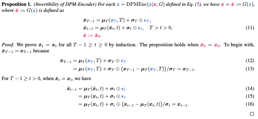 본 논문에서는 이러한 속성을 stochastic한 DPM으로 확장해서 모든 timestep $t$에서의 추가되는 gaussian noise들을 모두 concat해서 latent를 만들고 이러한 latent가 이미지 $x$에 대한 latent code가 되는 방식을 제안한다. 본 논문에서 제안한 latent code로 기존 idea를 deterministic한 DPM에서 stochastic한 DPM으로 확장시킨다.
