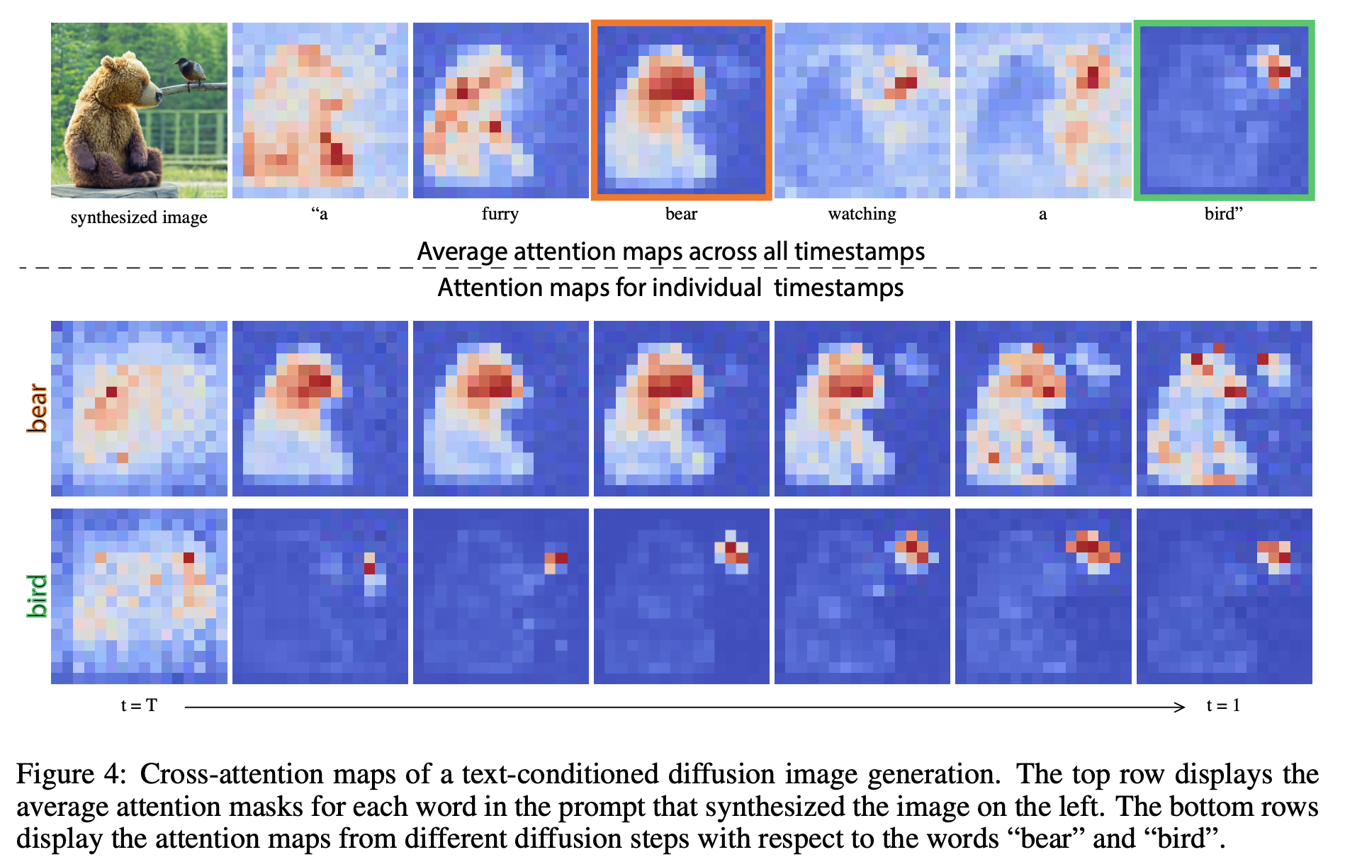 생성된 이미지의 spatial layout과 geometry는 cross-attention maps에 의존한다. 위 이미지에서 볼 수 있듯이 픽셀들은 그것들을 묘사하는 단어에 더 attract된다. 흥미롭게도, 이미지의 구조는 이미 diffusion의 초기 process에서 결정된다는 것을 볼 수 있다.