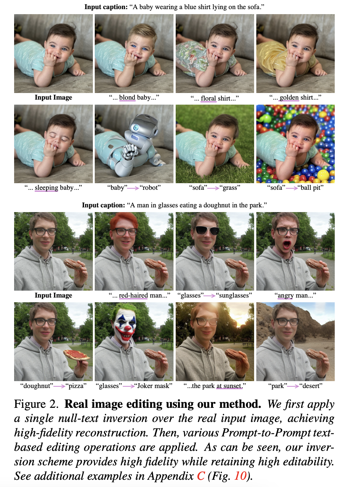 본 논문의 방식은 real image에 대해서 Prompt-to-Prompt를 적용시킬 수 있게 한다. 또한 fine-tuning을 필요로 하지 않고 SD를 사용해서 고퀄리티의 local, global modification이 가능하다.