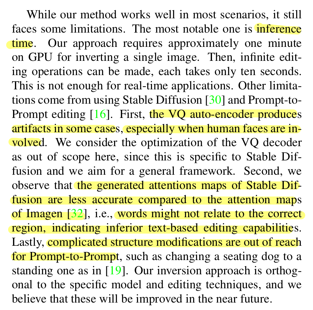 Null-text optimization과 비교해서 editability가 줄어든다. 특히 attention map이 덜 정확해서 Prompt-to-Prompt editing의 성능이 감소한다.