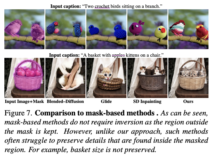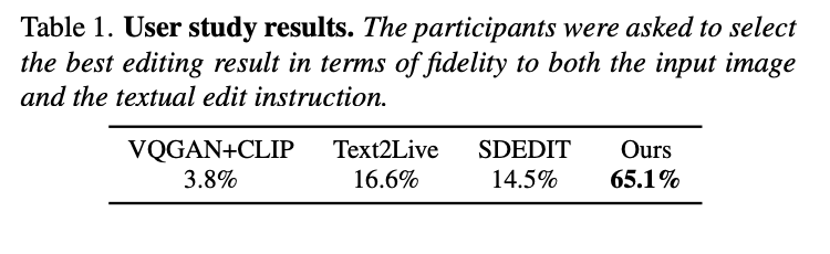 본 논문은 text-only editing method인 VQGAN + CLIP, Text2Live, SDEdit과 mask-based methods인 Glide, Blended-Diffusion, Stable Diffusion Inpaint와 비교한다. 또 Imagic이라는 Imagen모델을 editing operation마다 model-tuning하는 방식과도 비교한다.