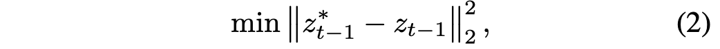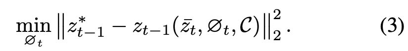 모든 $t < T$에 대해, optimization은 이전 step $(t+1)$ optimization의 endpoint로 부터 시작해야만 한다는 것에 주목해야한다. 그렇지 않으면 inference시에 최적화된 trajectory가 유지되지 않는다고 한다. 그러므로 step $t$의 optimization이후, noisy latent $\bar{z}_t$를 계산한다. 이는 다음 step의 optimization에서 사용되고 이는 새로운 trajectory가 $z_0$ 주변에서 끝나는 것을 보장한다.