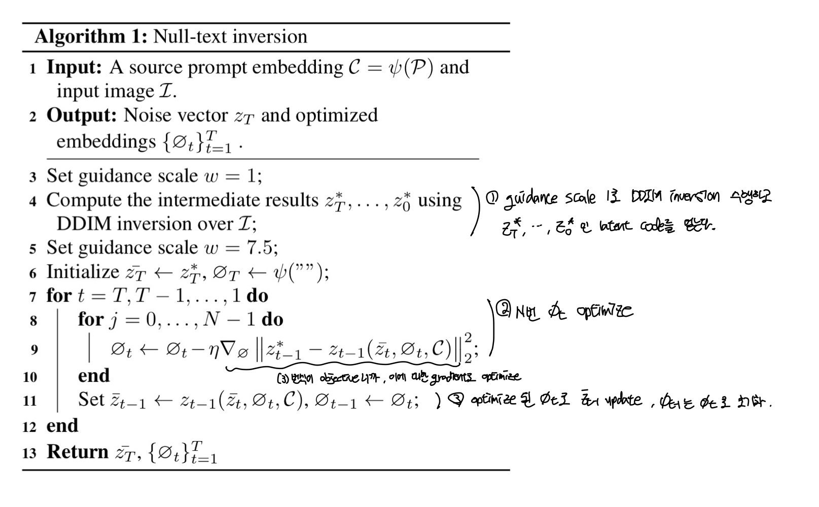 이 방식을 통해 $\bar{z_T} = z^*_T$와 optimize된 unconditional embeddings $\{ \varnothing_t \}^T_{t=1}$를 통해 real input image를 editing할 수 있다.