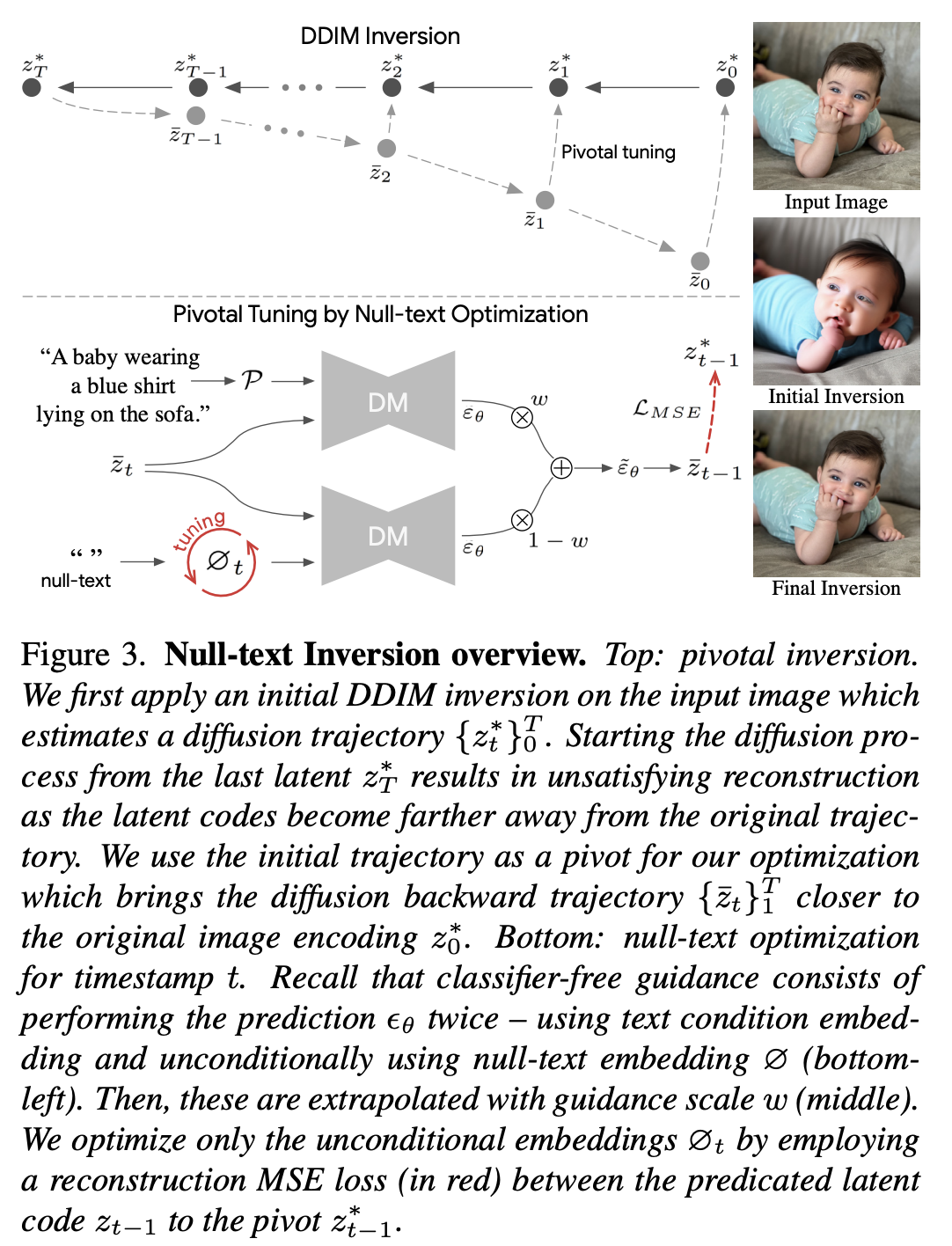 본 논문의 approach는 두가지 main observation을 base로 한다. 첫번째, DDIM inversion은 classifier-free guidance가 적용될 때 만족스럽지 못한 reconstruction을 제공하지만, optimization에 대한 좋은 출발점을 제공한다는 것이다. 두번째, classifier-free guidance에서 사용되는 unconditional null embedding을 최적화하는 것은 모델과 conditional embedding의 tuning을 피하면서 정확한 reconstruction을 제공한다. 그로 인해 바래진 editing 능력을 보존한다.