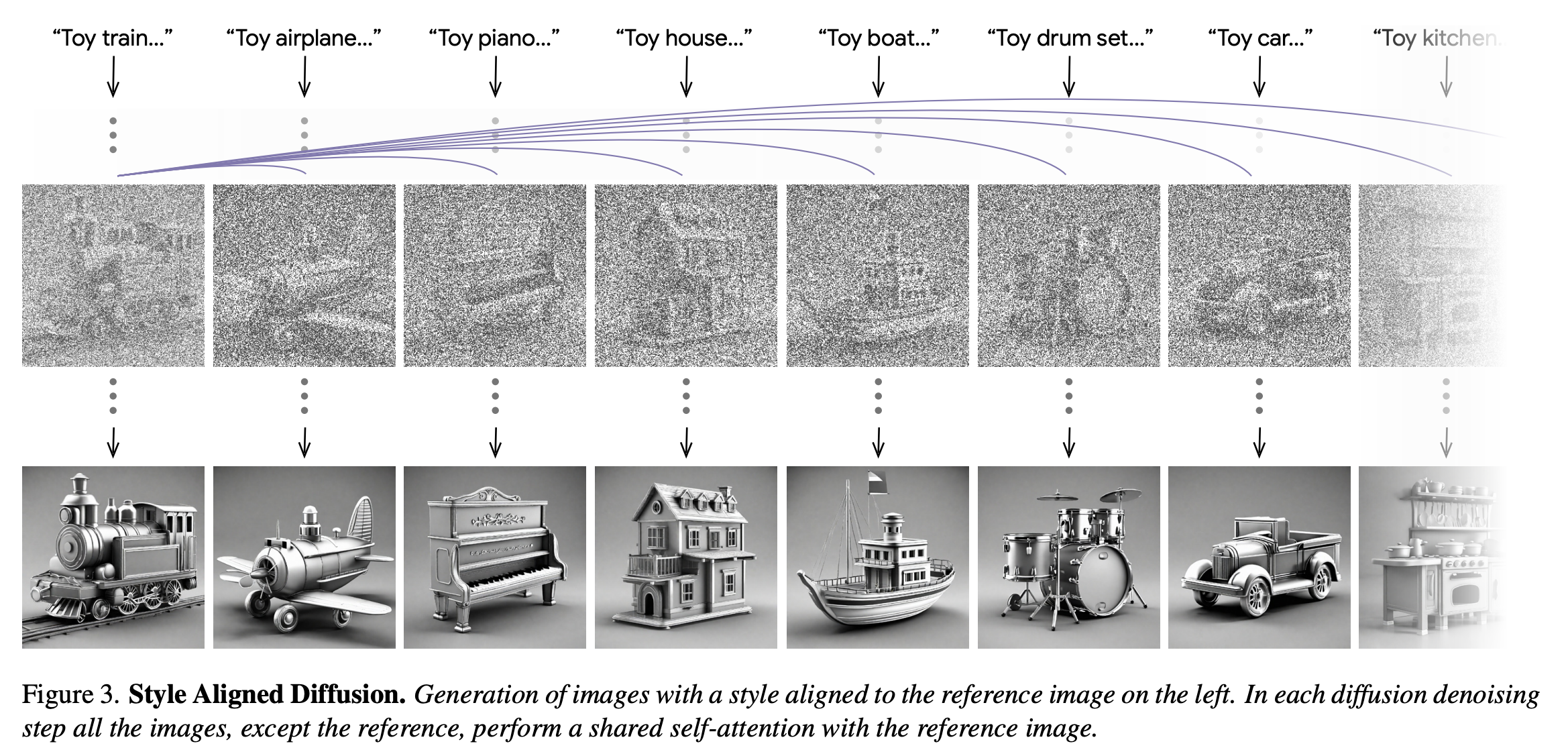 그러나 full attention sharing을 하면, 생성된 이미지 set의 퀄리티가 떨어진다고 한다. 위 이미지에서 아래 이미지들을 보면 full attention sharing은 이미지들에 대해 content leakage를 초래하는 것을 볼 수 있다. 게다가, full attention sharing은 동일한 prompts에 대해서 덜 다양한 결과를 생성한다.