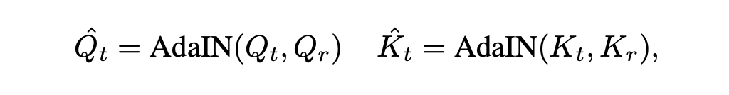 이 문제를 해결하기 위해 본 논문에서는 다음과 같은 AdaIN을 사용해서 target image의 쿼리와 키를 reference image의 쿼리와 키를 이용해 normalize한다.