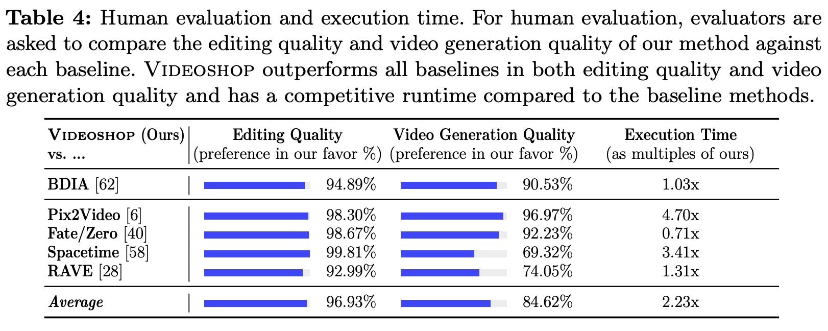 - User study에서도 다른 text-based video editing 방식들을 능가했다.