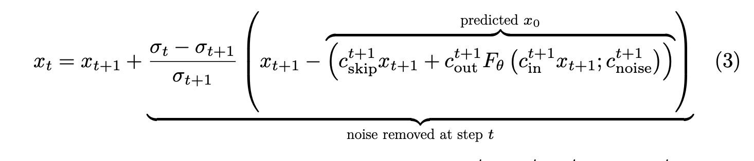 EDM framework에서의 deterministic sampling의 $x_{t+1} \rightarrow x_t$으로의 denoising step은 다음 수식처럼 표현된다.
