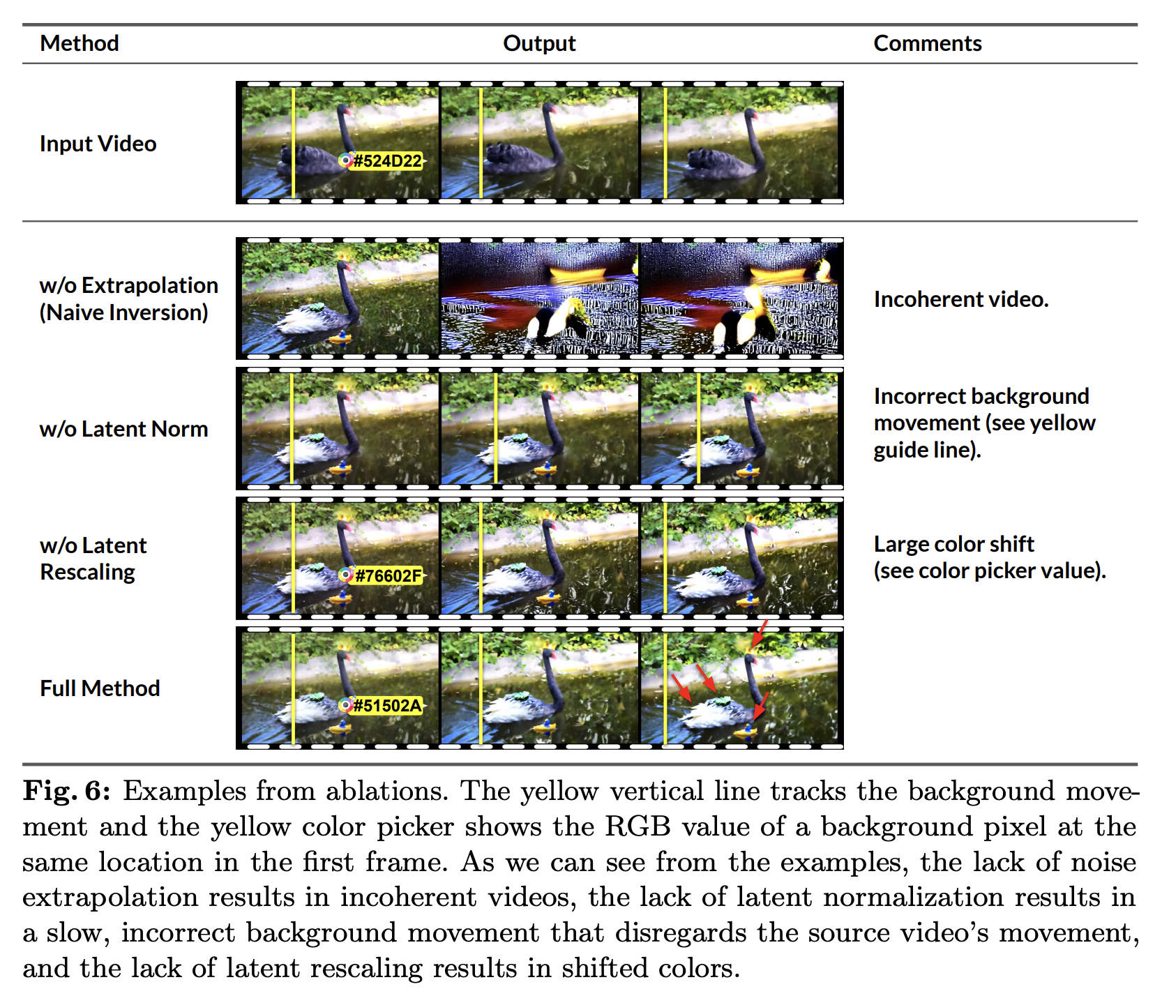위 결과를 보면 noise extrapolation이 없으면 incoherent video를 생성하고, normalization이 없으면 source video에서의 motion을 무시하는 느리고 부정확한 background movement를 야기한다. 그리고 rescaling이 없으면 shifted color를 야기한다.