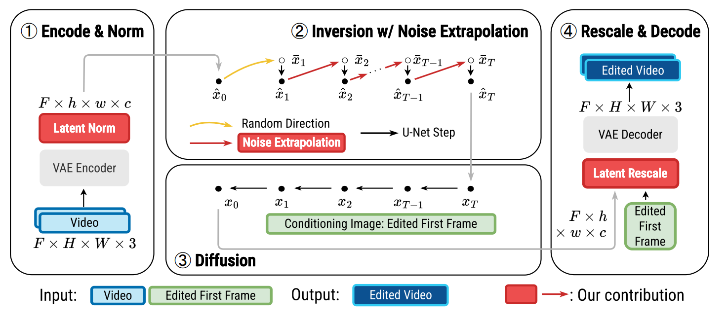DDIM inversion에서 현재 timestep의 latent를 사용해서 다음 timestep에서의 노이즈를 approximate한다. 본 논문에서는 이 approximation이 image-to-video diffusion에서 단지 첫번째 frame만 정확하게 reconstruction하고, 이는 누적되는 approximation error들때문에 불안정적인 latent를 이끈다는 것을 발견했다. 본 논문은 denoising process동안 latents가 near-linear라는 것을 드러낸다. 본 논문은 이 관찰을 이용하고 inversion with noise extrapolation을 도입한다. 이는 어떠한 video에서라도 faithful reconstruction을 이루도록하는 매커니즘이다. 또한 본 논문은 video latents는 unnormalize됐고 이는 instability를 이끈다는 것을 드러낸다. 본 논문은 consistency와 quality를 보장하는 latent normalization technique를 도입한다.