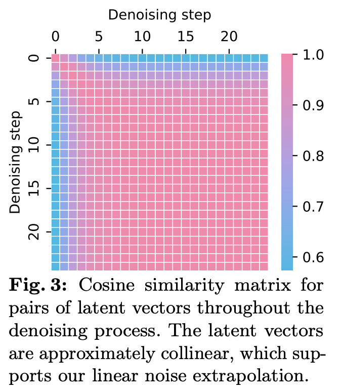 위의 결과를 보면 초기 스텝 후에는 denoising step에 따른 cosine similarity가 높은 것을 볼 수 있다. 이는 low noise level 이후에는 $x_t$의 trajectory는 거의 linear하다는 것을 보여준다.