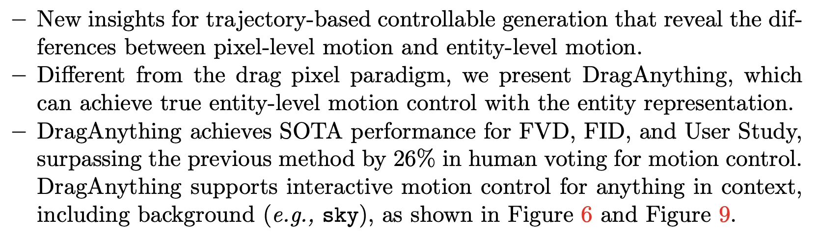 최근 controllabel video generation에서 trajectory-based motion control이 user-friendly하고 efficient solution이라는 것이 증명됐다. 대표적인 예로 Drag-NUWA와 MotionCtrl이 있다고 한다. 이 두 모델은 controllable video generation에서 상당한 contribution을 만들었다고 한다. 그런데 중요한 질문인 "Can a single point onn the target truly represent the target?"을 간과해왔다.