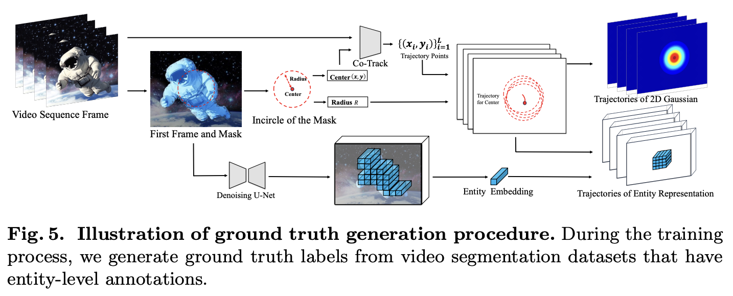 위 이미지에서와 같이 첫번째 frame의 entity의 center coordinate $\{ (x^1, y^1), \cdots, (x^k, y^k) \}$가 주어지면, Co-Tracker를 통해 이 point들을 track하고 대응되는 motion trajectory $\{ \{(x^1_i, y^1_i) \}^L_{i=1}, \cdots, \{ (x^k_i, y^k_i) \}^L_{i=1} \}$를 얻는다. 이를 통해 대응되는 entity representation $\{ \mathbf{\hat{E}_i} \}^L_{i=1}$을 얻을 수 있다.