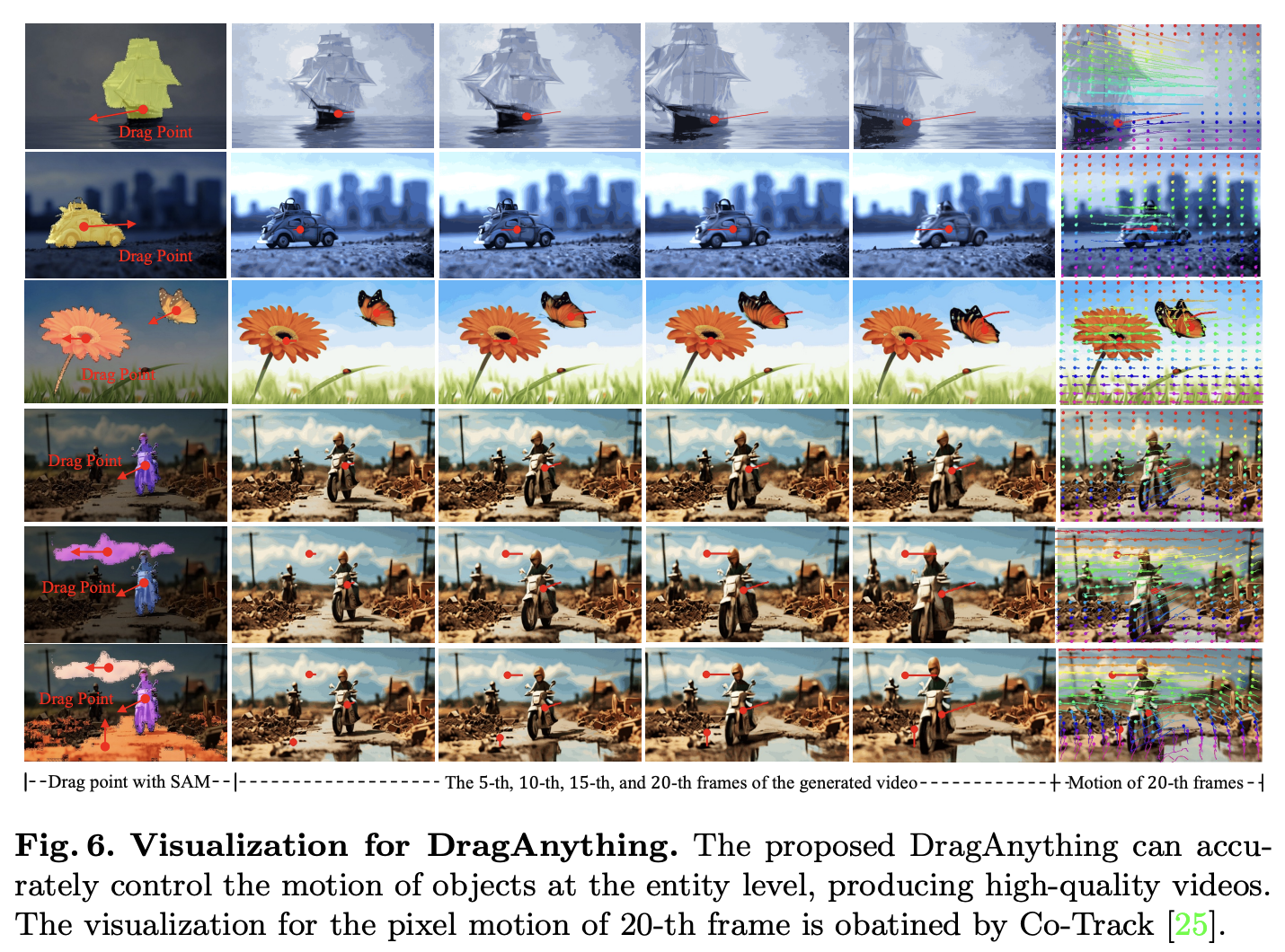 Inference시에는 유저가 컨트롤하고 싶은 영역을 click하고 픽셀을 드래그한다. 이를 통해 DragAnything은 비디오를 생성할 수 있다.