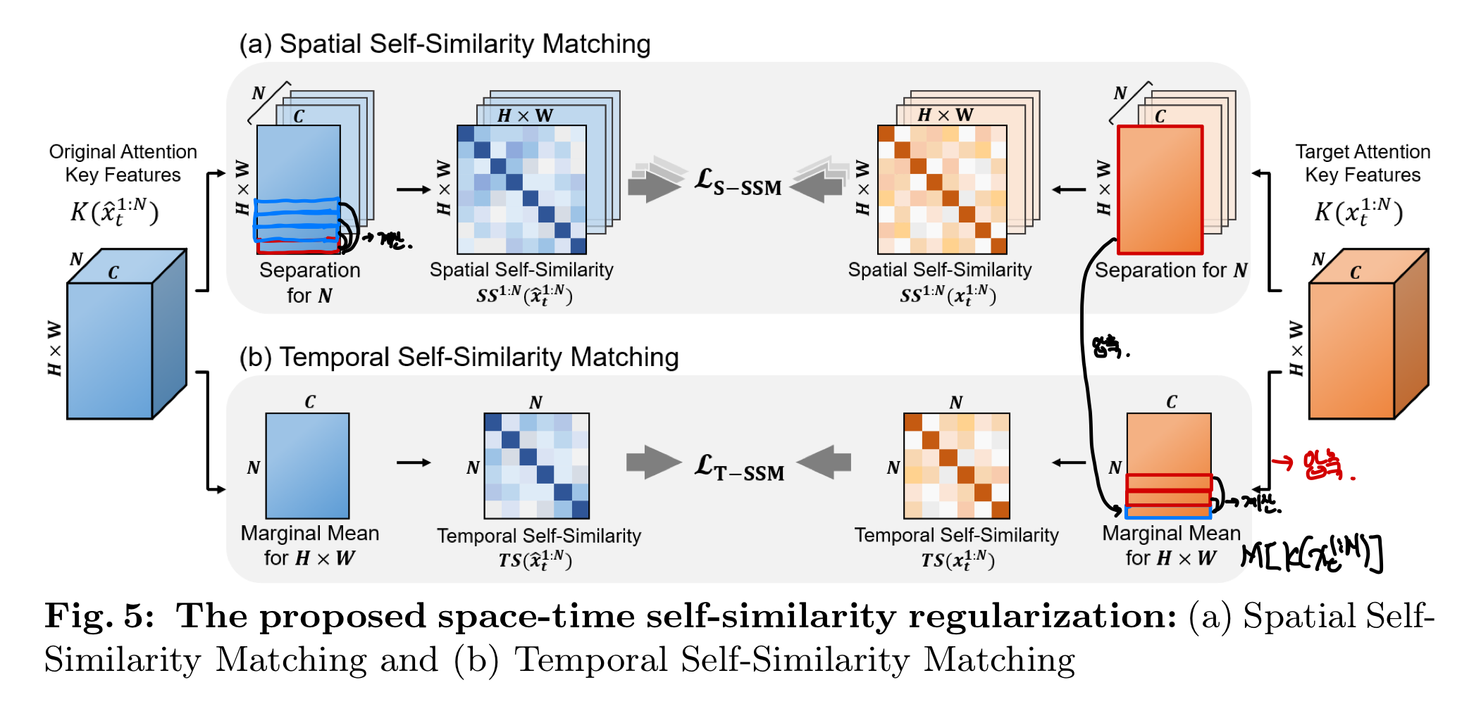 비록 spatial self-similarity alignment가 original과 target video 사이의 structural consistency를 유지시키지만, 이는 frame간의 temporal correlation을 고려하지 않는 frame-independent optimization method로써 작동한다. 이러한 operation은 optimized frame에서의 localized distortions과 notable flickering을 야기한다. 이를 해결하기 위해서 본 논문에서는 frame 축에 따라서 self-similarity를 활용함으로써 temporal correlation을 모델링하는 $\mathcal{L}_{S-SSM}$의 temporal regularization을 도입한다.