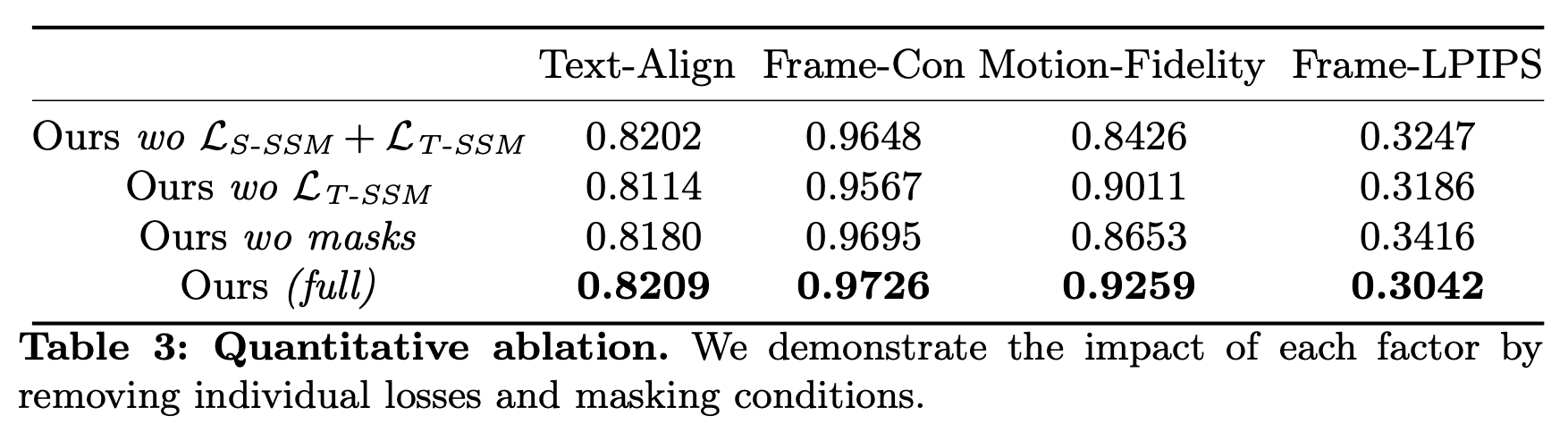 아래 이미지들은 본 논문에서 제안한 self-similarity guidance에 대한 ablation study 결과이다. Spatial self-similarity loss의 부재는 프레임에 따라 object structure에서의 inconsistency를 야기한다. 두 번째 이미지에서 첫 번째 예시를 보면 새의 날개 형태가 다른 것을 볼 수 있다. Spatial self-similarity가 구조적인 integrity를 보존하지만, artifacts를 생성할 수 있다. 그러나 이러한 artifact들은 temporal self-similarity를 통해 해결된다.