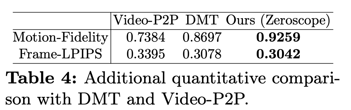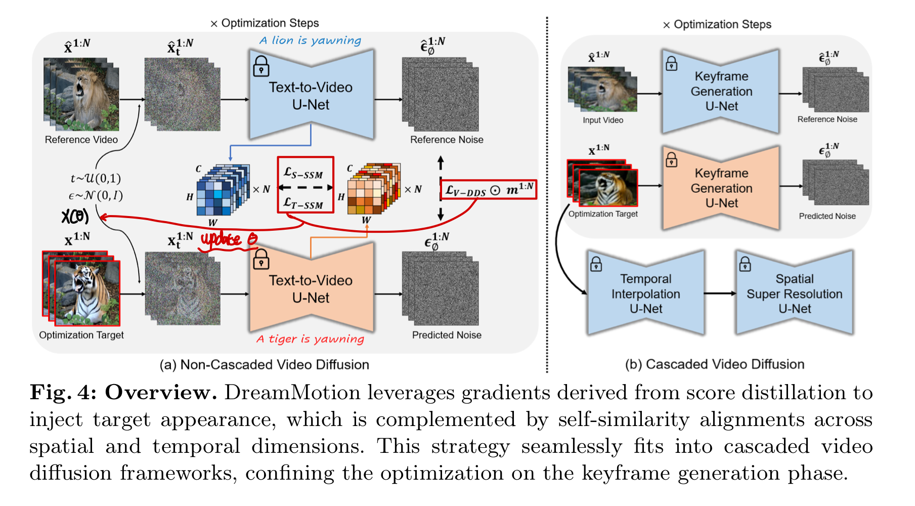 본 논문은 기존의 Video Editing 방식들과 다르게, standard reverse diffusion process를 우회하고 이미 자연스러운 motion을 보이는 video로부터의 optimization을 초기화하기 위해 score distillation sampling에 집중한다. 본 논문은 video score distillation이 target text으로 나타내지는 새로운 content를 효과적으로 도입할 수 있지만, 이는 또한 상당한 structure와 motion deviation을 가져올 수 있다. 이를 해결하기 위해서, 본 논문은 score distillation동안 original video와 edited video의 space-time self-similarity들을 매칭하는 것을 제안한다.