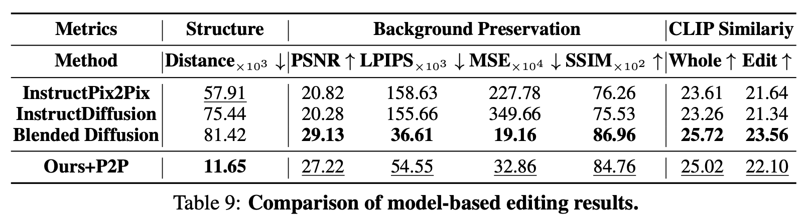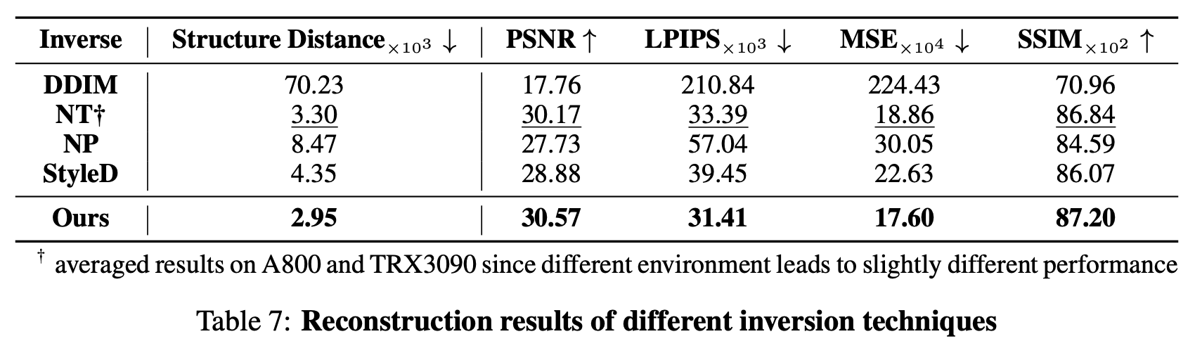 Edit Friendly DDPM, Negative-Prompt Inversion, EDICT와 같은 inversion 기법들과 비교해서, optimization-based methods(Null-Text Inversion, StyleDIffusion)은 DDIM sampling에서 분포에 영향을 끼치지 않고, text condition들에 대한 충분한 guidance를 유지하고, diffusion model의 editability를 유지한다.