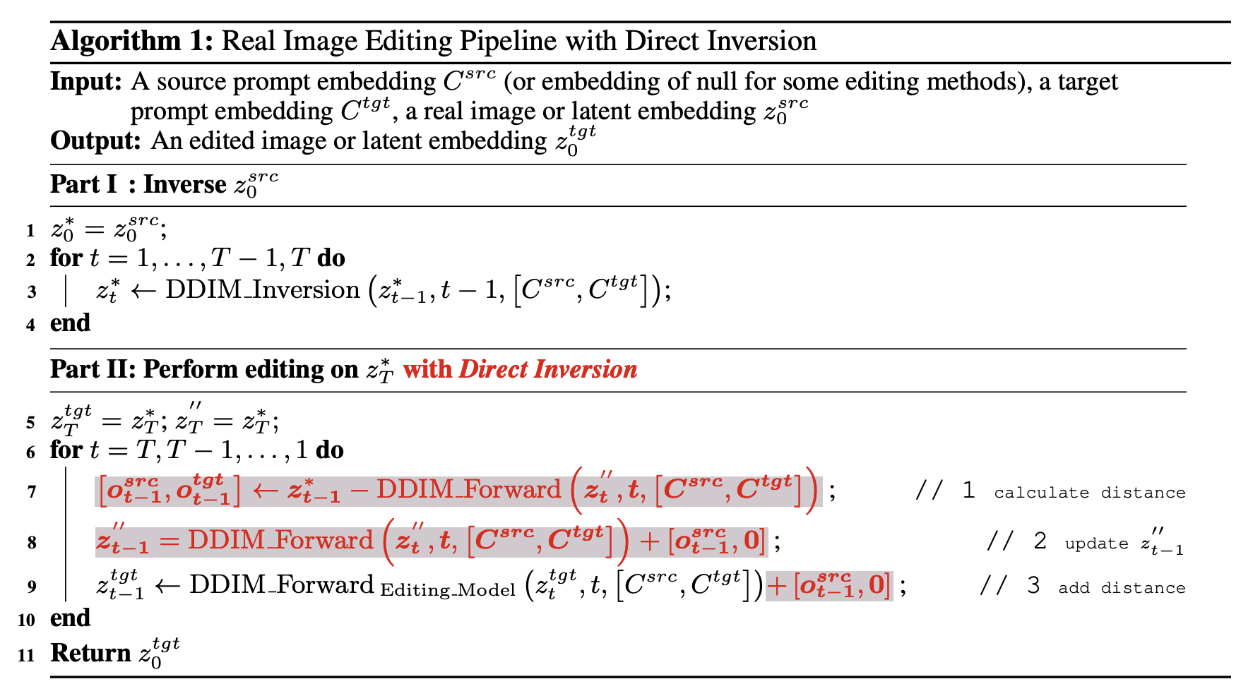 전체적인 알고리즘은 위와 같다. 본 논문은 8번 줄에서 $z^{''}_{t-1} = z^*_{t-1}$를 하는 대신에 latent space에서 source prompt의 difference를 단지 더하고 $z^{''}_{t-1}$을 update한다. 이 부분이 target prompt의 latent space의 editability를 유지하는 key이다.