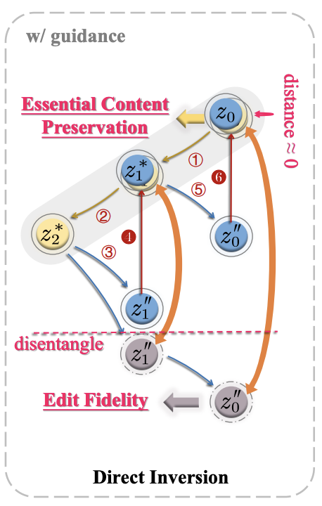 Image editing을 수행할 때, 그 image에 대한 latent space를 모르면 diffusion model을 inverting해서 latent vector를 얻어서 진행했다. 기존 Null-Text Inversion과 Negative-Prompt Inversion과 같은 optimization-based 방식들은 위 이미지와 같이 generation model의 input parameter를 간접적으로 조작함으로써 $z_0$와 $z^{''}_0$의 거리를 최소화하려 노력했다. 이러한 방식들은 target latent의 optimization을 단지 몇 번의 iteration으로 제한한다. 이는 결국 $z^{''}_0$와 $z_0$사이의 gap을 야기한다. 이러한 forced input assignment는 모델의 generation 능력을 방해하고, source와 editing branch의 integrity를 해친다.
