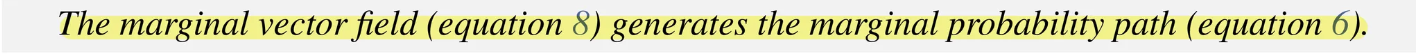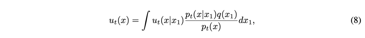 - (8) 식은 conditional vector field를 가중합하면 marginal vector field가 된다는 것을 나타냄.