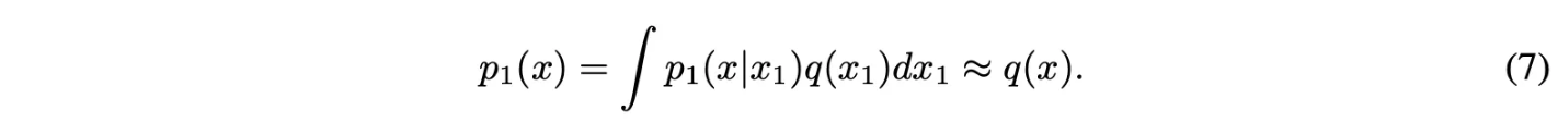 - $t=1$일 때, $p_1(x|x_1)$는 $x=x_1$에 집중된 분포로 디자인($p_1(x|x_1) = \mathcal{N}(x|x_1,\sigma^2I)$, 여기서 $\sigma>0$는 충분히 작음)