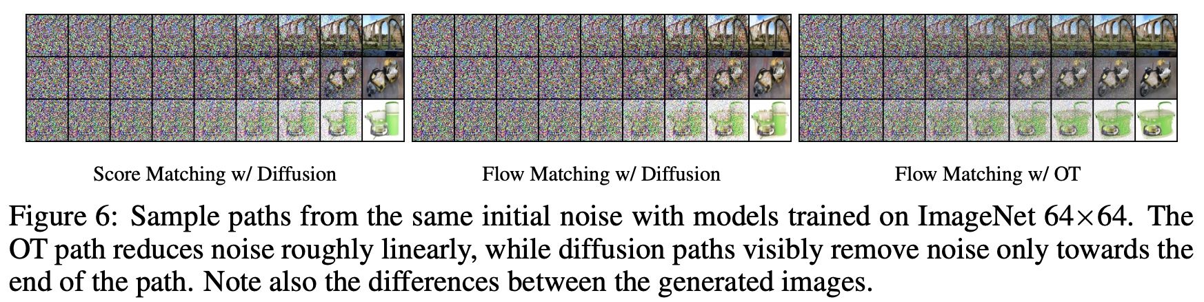 OT path를 사용할 때 diffusion path보다 더 이르게 이미지를 생성하기 시작.