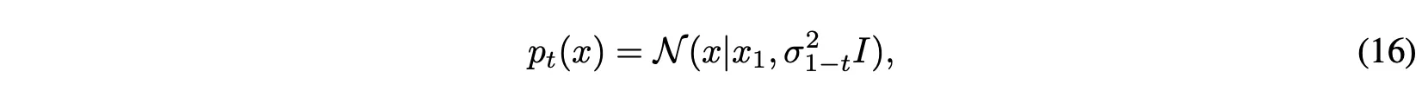 여기서 $\mu_0(x_1)=0, \sigma_0(x_1)=1$라고 셋팅. → 모든 conditional probability path가 $t=0$에서는 $p(x) = \mathcal{N}(x|0,I)$인 동일한 Standard Gaussian noise distribuiton으로 converge.