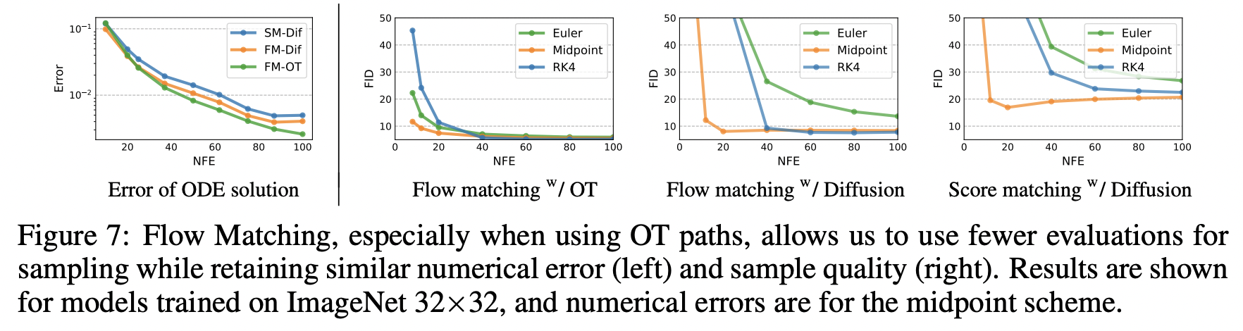 FM with OT가 가장 좋은 numerical error를 보임. → 60%의 NFE로 diffusion model과 동일한 error threshold에 도달