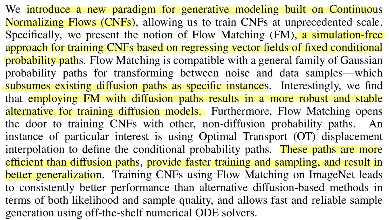 CNF 모델을 학습시키는 효율적인 simulation-free approach. → CNF training을 supervise하는 일반적인 probability path의 선택을 허용함.